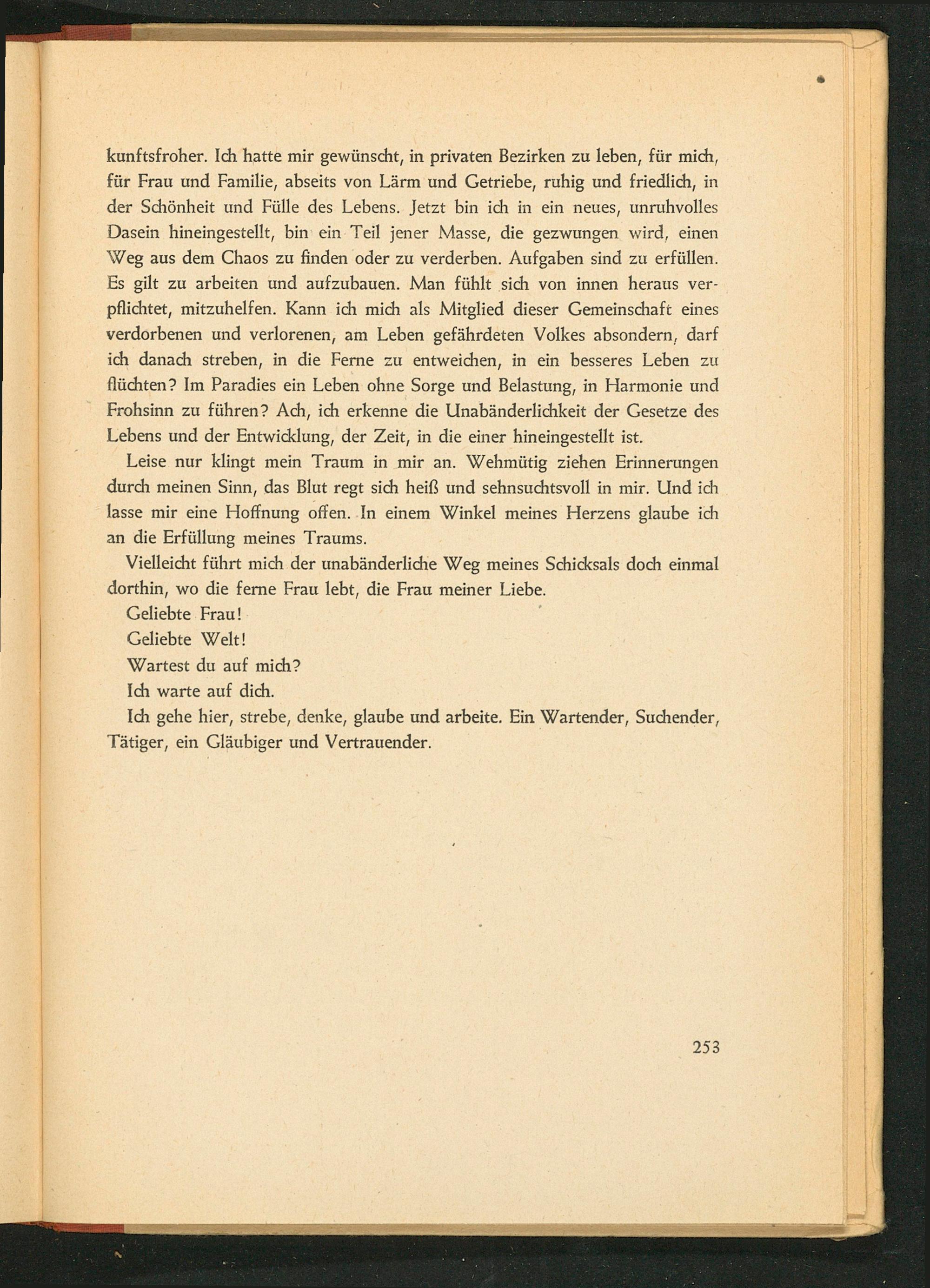 kunftsfroher. Ich hatte mir gewünscht, in privaten Bezirken zu leben, für mich, für Frau und Familie, abseits von Lärm und Getriebe, ruhig und friedlich, in der Schönheit und Fülle des Lebens. Jetzt bin ich in ein neues, unruhvolles Dasein hineingestellt, bin’ ein Teil jener Masse, die gezwungen wird, einen Weg aus dem Chaos zu finden oder zu verderben. Aufgaben sind zu erfüllen. Es gilt zu arbeiten und aufzubauen. Man fühlt sich von innen heraus ver- pflichtet, mitzuhelfen. Kann ich mich als Mitglied dieser Gemeinschaft eines verdorbenen und verlorenen, am Leben gefährdeten Volkes absondern, darf ich danach streben, in die Ferne zu entweichen, in ein besseres Leben zu flüchten? Im Paradies ein Leben ohne Sorge und Belastung, in Harmonie und Frohsinn zu führen? Ach, ich erkenne die Unabänderlichkeit der Gesetze des Lebens und der Entwicklung, der Zeit, in die einer hineingestellt ist.