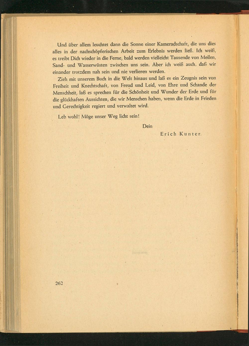 Und über allem leuchtet dann die Sonne einer Kameradschaft, die uns dies alles in der nachschöpferischen Arbeit zum Erlebnis werden ließ. Ich weiß, es treibt Dich wieder in die Ferne, bald werden vielleicht Tausende von Meilen, Sand- und Wasserwüsten zwischen uns sein. Aber ich weiß auch, daß wir einander trotzdem nah sein und nie verlieren werden.
