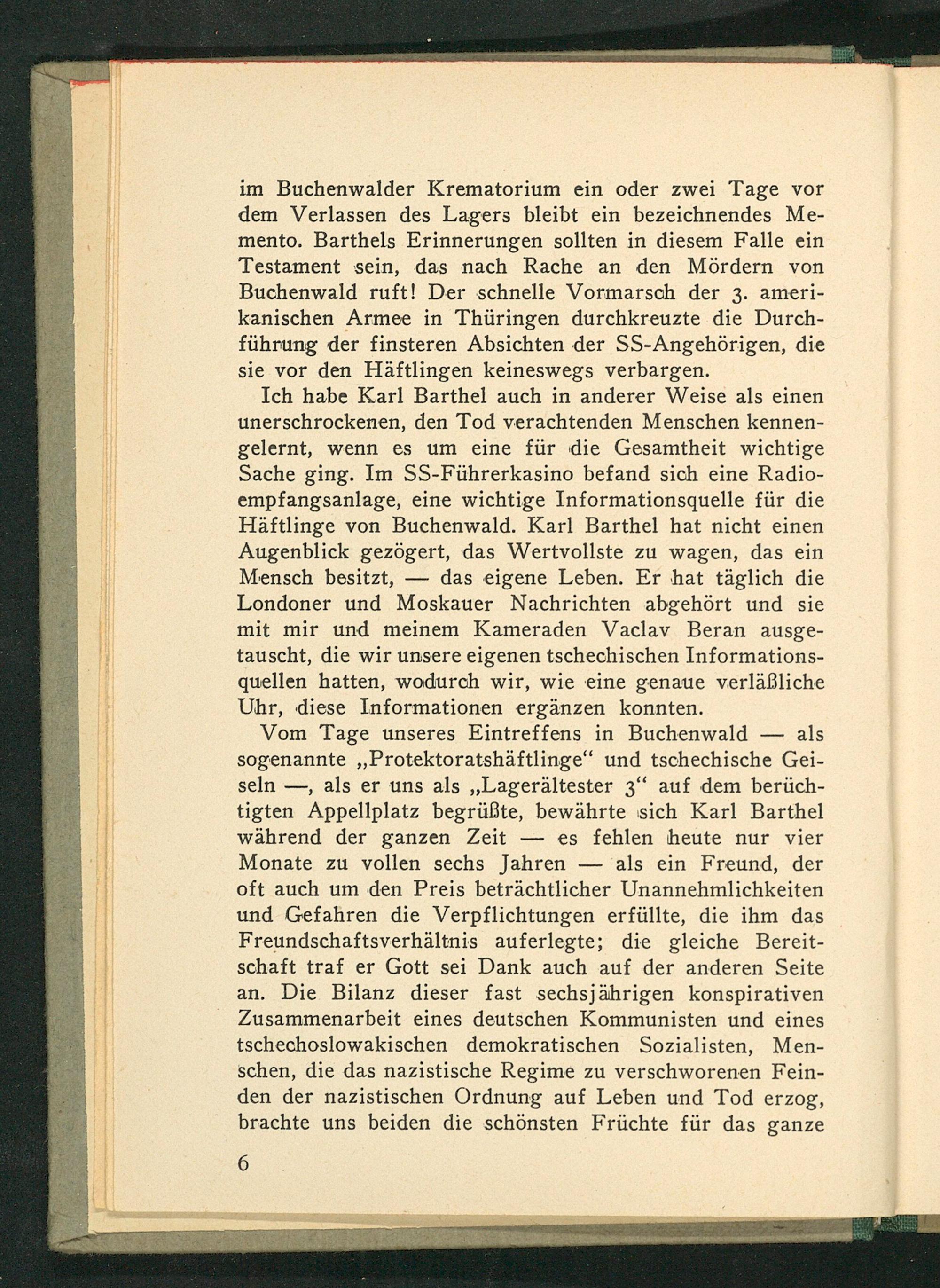 Vom Tage unseres Eintreffens in Buchenwald sogenannte ,, Protektoratshäftlinge" und tschechische Geiseln-, als er uns als ,, Lagerältester 3" auf dem berüchtigten Appellplatz begrüßte, bewährte sich Karl Barthel während der ganzen Zeit es fehlen heute nur vier Monate zu vollen sechs Jahren als ein Freund, der oft auch um den Preis beträchtlicher Unannehmlichkeiten und Gefahren die Verpflichtungen erfüllte, die ihm das Freundschaftsverhältnis auferlegte; die gleiche Bereitschaft traf er Gott sei Dank auch auf der anderen Seite an. Die Bilanz dieser fast sechsjährigen konspirativen Zusammenarbeit eines deutschen Kommunisten und eines tschechoslowakischen demokratischen Sozialisten, Menschen, die das nazistische Regime zu verschworenen Feinden der nazistischen Ordnung auf Leben und Tod erzog, brachte uns beiden die schönsten Früchte für das ganze
