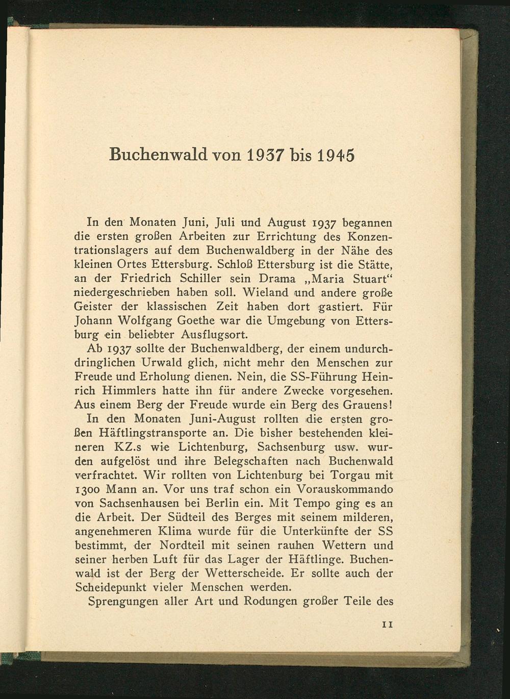 In den Monaten Juni, Juli und August 1937 begannen die ersten großen Arbeiten zur Errichtung des Konzentrationslagers auf dem Buchenwaldberg in der Nähe des kleinen Ortes Ettersburg. Schloß Ettersburg ist die Stätte, an der Friedrich Schiller sein Drama ,, Maria Stuart" niedergeschrieben haben soll. Wieland und andere große Geister der klassischen Zeit haben dort gastiert. Für Johann Wolfgang Goethe war die Umgebung von Ettersburg ein beliebter Ausflugsort.