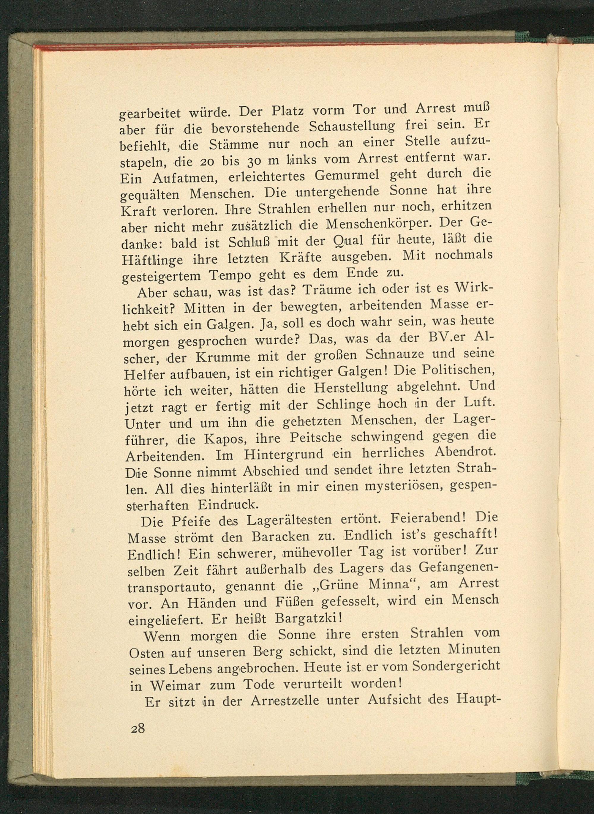 Die Pfeife des Lagerältesten ertönt. Feierabend! Die Masse strömt den Baracken zu. Endlich ist's geschafft! Endlich! Ein schwerer, mühevoller Tag ist vorüber! Zur selben Zeit fährt außerhalb des Lagers das Gefangenentransportauto, genannt die„ Grüne Minna", am Arrest vor. An Händen und Füßen gefesselt, wird ein Mensch eingeliefert. Er heißt Bargatzki!