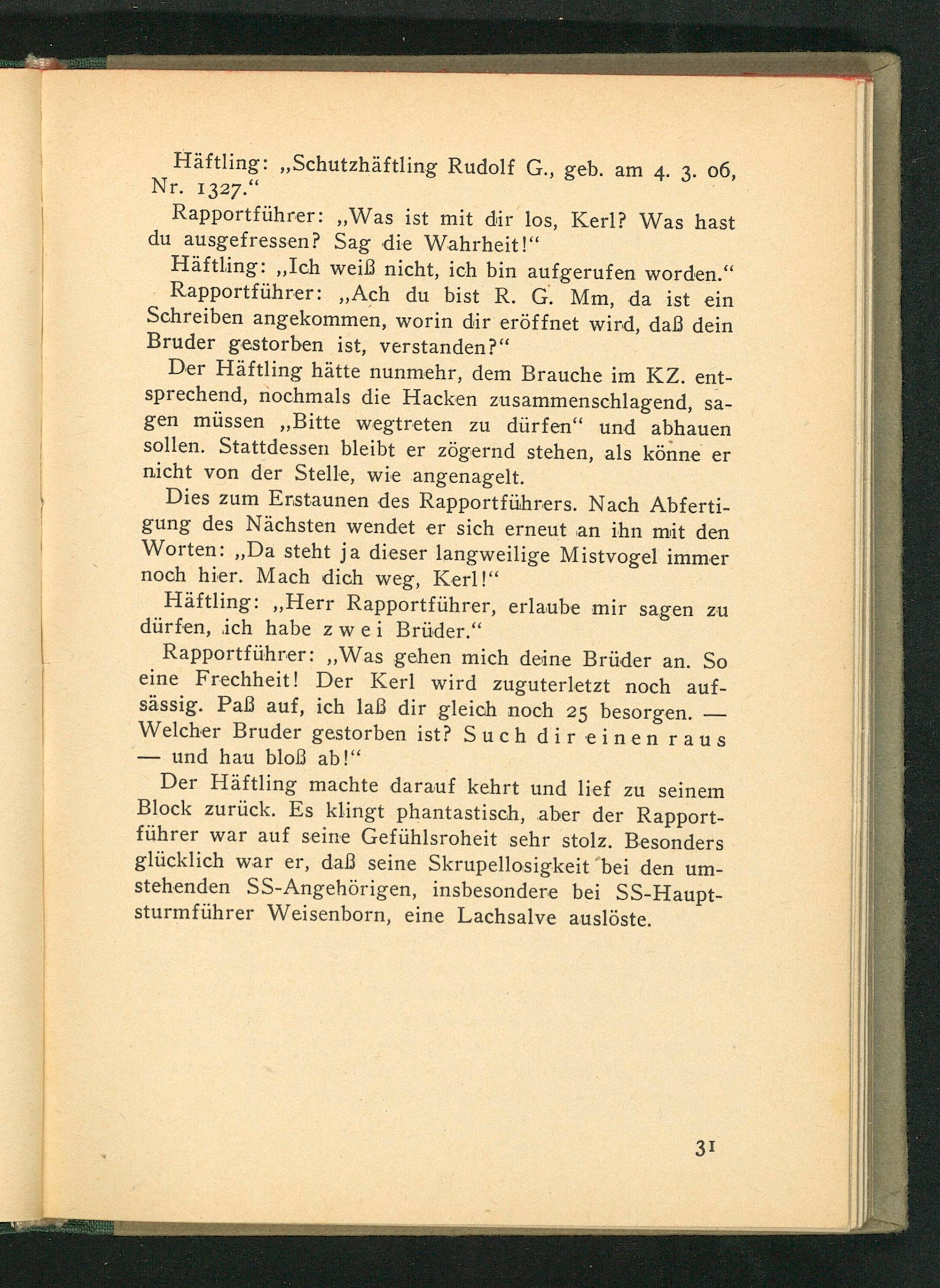 Häftling: ,, Ich weiß nicht, ich bin aufgerufen worden." Rapportführer: ,, Ach du bist R. G. Mm, da ist ein Schreiben angekommen, worin dir eröffnet wird, daß dein Bruder gestorben ist, verstanden?"