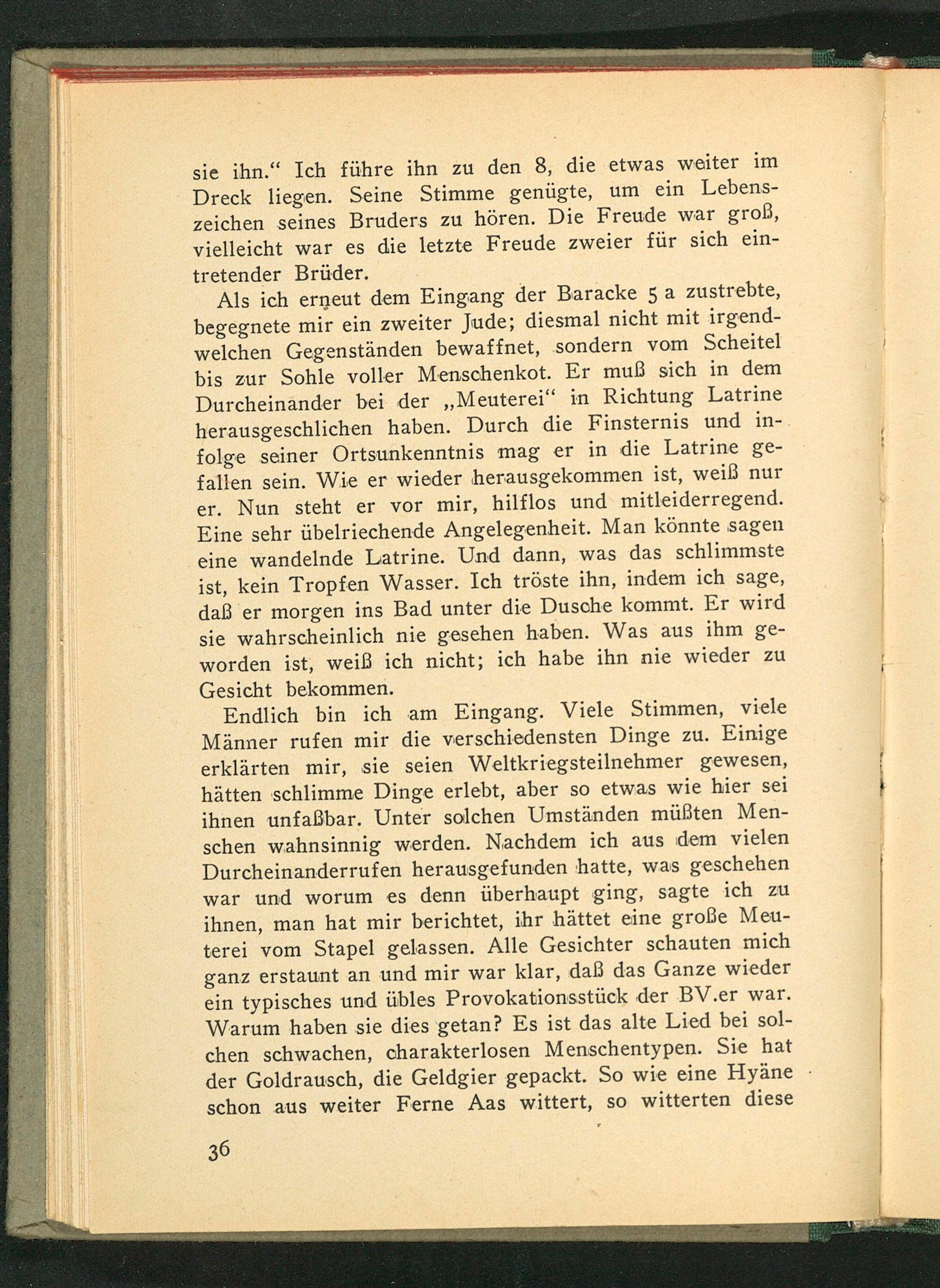 Als ich erneut dem Eingang der Baracke 5 a zustrebte, begegnete mir ein zweiter Jude; diesmal nicht mit irgendwelchen Gegenständen bewaffnet, sondern vom Scheitel bis zur Sohle voller Menschenkot. Er muß sich in dem Durcheinander bei der ,, Meuterei" in Richtung Latrine herausgeschlichen haben. Durch die Finsternis und infolge seiner Ortsunkenntnis mag er in die Latrine gefallen sein. Wie er wieder herausgekommen ist, weiß nur er. Nun steht er vor mir, hilflos und mitleiderregend. Eine sehr übelriechende Angelegenheit. Man könnte sagen eine wandelnde Latrine. Und dann, was das schlimmste ist, kein Tropfen Wasser. Ich tröste ihn, indem ich sage, daß er morgen ins Bad unter die Dusche kommt. Er wird sie wahrscheinlich nie gesehen haben. Was aus ihm geworden ist, weiß ich nicht; ich habe ihn nie wieder zu Gesicht bekommen.