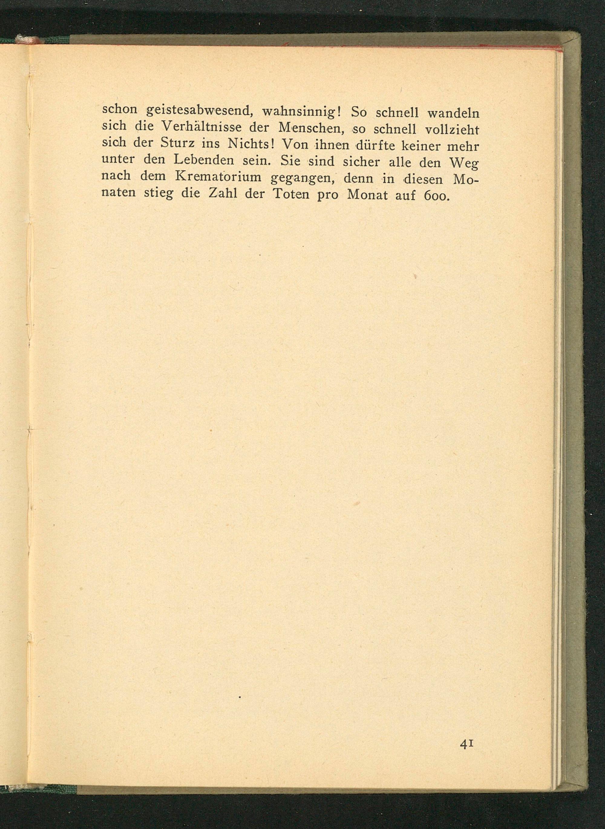 schon geistesabwesend, wahnsinnig! So schnell wandeln sich die Verhältnisse der Menschen, so schnell vollzieht sich der Sturz ins Nichts! Von ihnen dürfte keiner mehr unter den Lebenden sein. Sie sind sicher alle den Weg nach dem Krematorium gegangen, denn in diesen Monaten stieg die Zahl der Toten pro Monat auf 600.