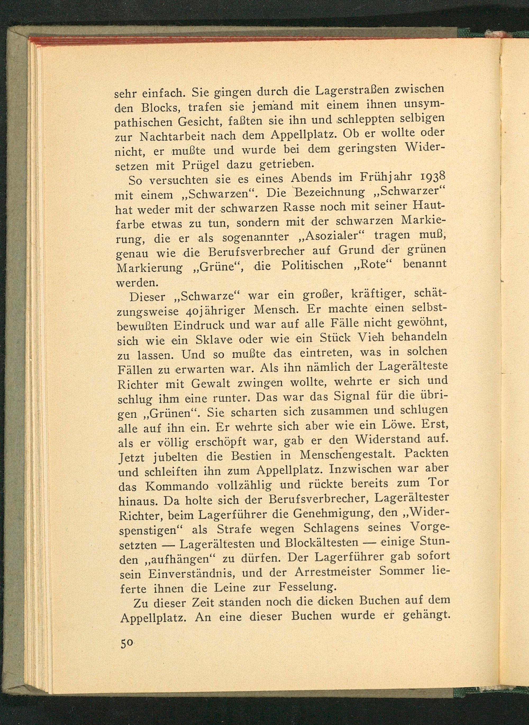 So versuchten sie es eines Abends im Frühjahr 1938 mit einem ,, Schwarzen". Die Bezeichnung ,, Schwarzer" hat weder mit der schwarzen Rasse noch mit seiner Hautfarbe etwas zu tun, sondern mit der schwarzen Markierung, die er als sogenannter„ Asozialer" tragen muß, genau wie die Berufsverbrecher auf Grund der grünen Markierung ,, Grüne", die Politischen ,, Rote " benannt
