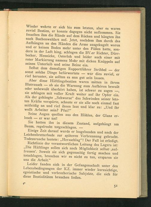 Aber diese Häftlingsbestien waren mitten in ihrem Blutrausch ob sie die Warnung zum Aufhören bewußt oder unbewußt überhört haben, ist schwer zu sagen sie schlugen mit voller Kraft weiter auf ihr Opfer ein. Als der gehängte ,, Schwarze " das Schwinden seiner letzten Kräfte verspürte, schaute er sie alle noch einmal fast mitleidig an und rief ihnen laut und klar zu:„ Und ihr wollt Arbeiter sein? Pfui!"