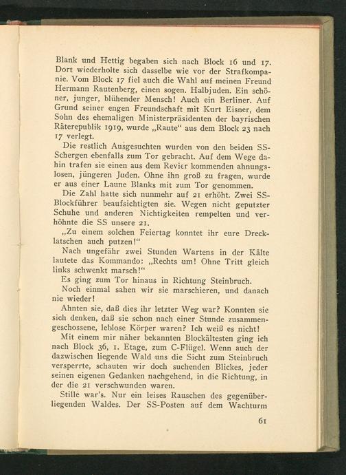 Blank und Hettig begaben sich nach Block 16 und 17. Dort wiederholte sich dasselbe wie vor der Strafkompanie. Vom Block 17 fiel auch die Wahl auf meinen Freund Hermann Rautenberg, einen sogen. Halbjuden. Ein schöner, junger, blühender Mensch! Auch ein Berliner . Auf Grund seiner engen Freundschaft mit Kurt Eisner , dem Sohn des ehemaligen Ministerpräsidenten der bayrischen Räterepublik 1919, wurde ,, Raute" aus dem Block 23 nach 17 verlegt.