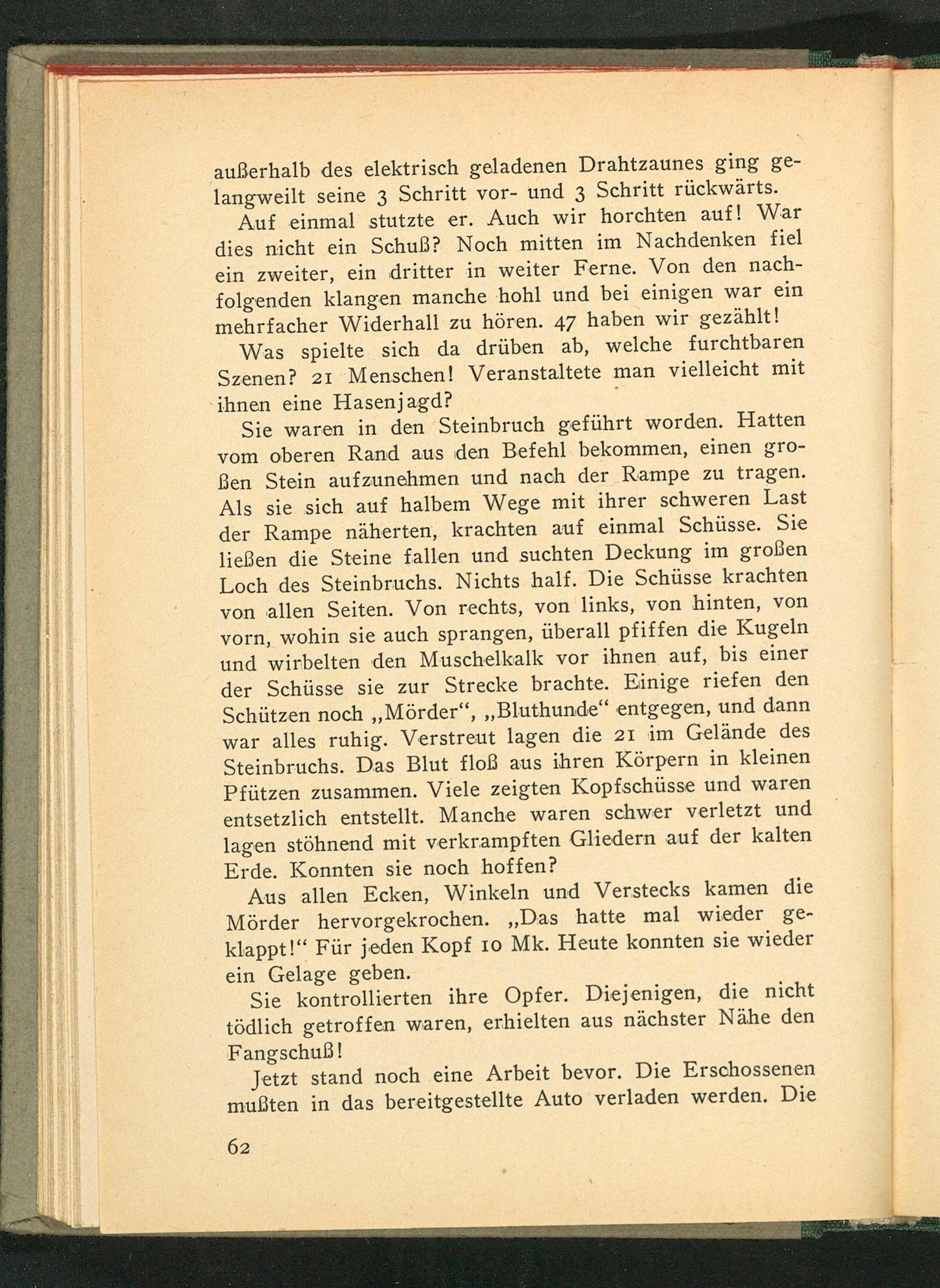 Sie waren in den Steinbruch geführt worden. Hatten vom oberen Rand aus den Befehl bekommen, einen groBen Stein aufzunehmen und nach der Rampe zu tragen. Als sie sich auf halbem Wege mit ihrer schweren Last der Rampe näherten, krachten auf einmal Schüsse. Sie ließen die Steine fallen und suchten Deckung im großen Loch des Steinbruchs. Nichts half. Die Schüsse krachten von allen Seiten. Von rechts, von links, von hinten, von vorn, wohin sie auch sprangen, überall pfiffen die Kugeln und wirbelten den Muschelkalk vor ihnen auf, bis einer der Schüsse sie zur Strecke brachte. Einige riefen den Schützen noch ,, Mörder" ,,, Bluthunde" entgegen, und dann war alles ruhig. Verstreut lagen die 21 im Gelände des Steinbruchs. Das Blut floß aus ihren Körpern in kleinen Pfützen zusammen. Viele zeigten Kopfschüsse und waren entsetzlich entstellt. Manche waren schwer verletzt und lagen stöhnend mit verkrampften Gliedern auf der kalten Erde. Konnten sie noch hoffen?