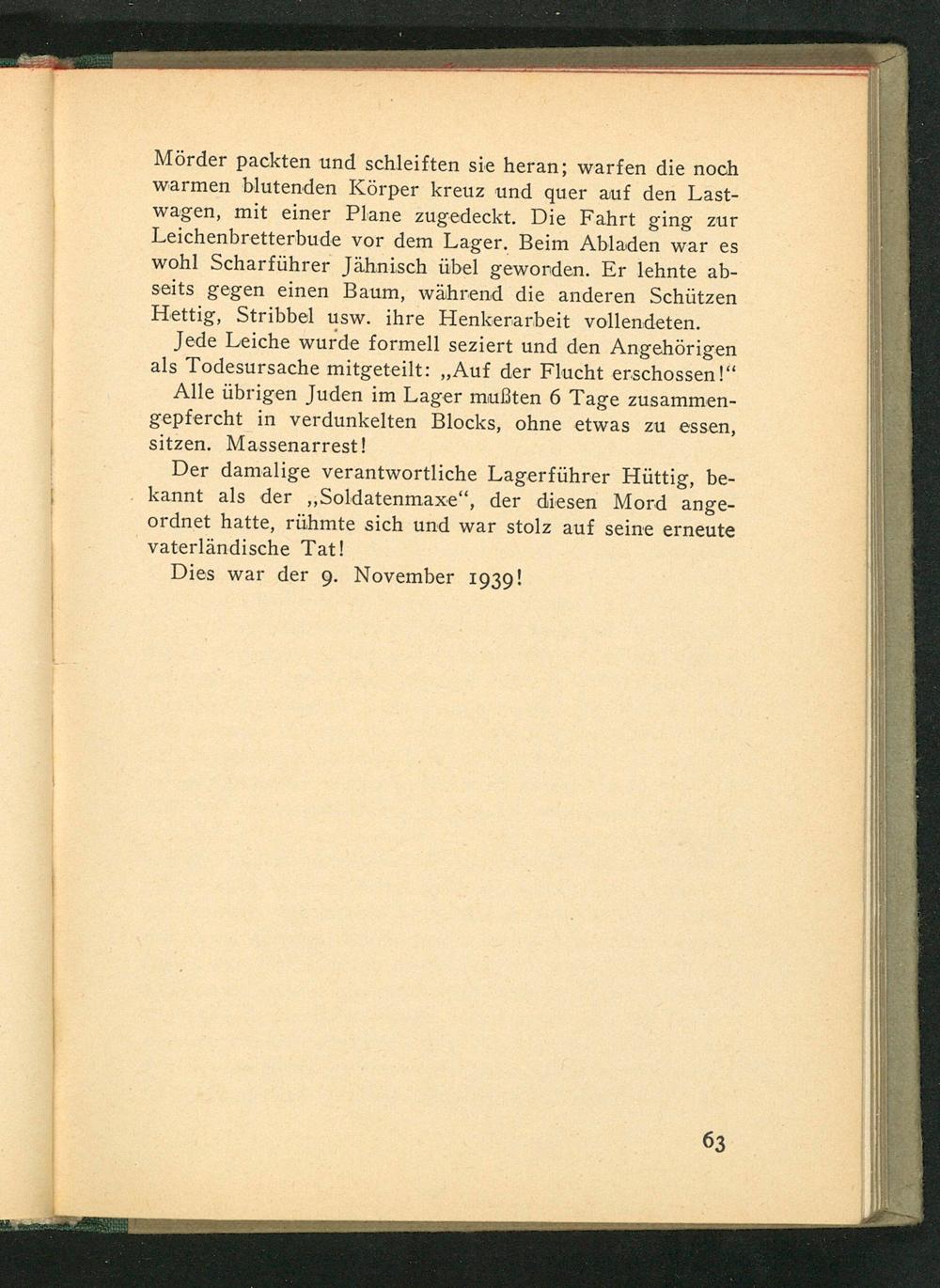 Jede Leiche wurde formell seziert und den Angehörigen als Todesursache mitgeteilt: ,, Auf der Flucht erschossen!" Alle übrigen Juden im Lager mußten 6 Tage zusammengepfercht in verdunkelten Blocks, ohne etwas zu essen, sitzen. Massenarrest!