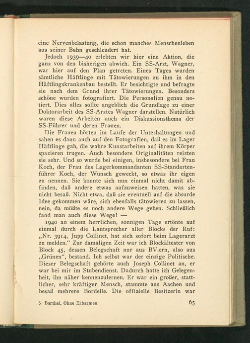 1940 an einem herrlichen, sonnigen Tage ertönte auf einmal durch die Lautsprecher aller Blocks der Ruf: ,, Nr. 3914, Jupp Collinet, hat sich sofort beim Lagerarzt zu melden." Zur damaligen Zeit war ich Blockältester von Block 45, dessen Belegschaft nur aus BV.ern, also aus ,, Grünen", bestand. Ich selbst war der einzige Politische. Dieser Belegschaft gehörte auch Joseph Collinet an, er war bei mir im Stubendienst. Dadurch hatte ich Gelegenheit, ihn näher kennenzulernen. Er war ein großer, stattlicher, sehr kräftiger Mensch, stammte aus Aachen und besaß mehrere Bordelle. Die offizielle Besitzerin war 5 Barthel, Ohne Erbarmen