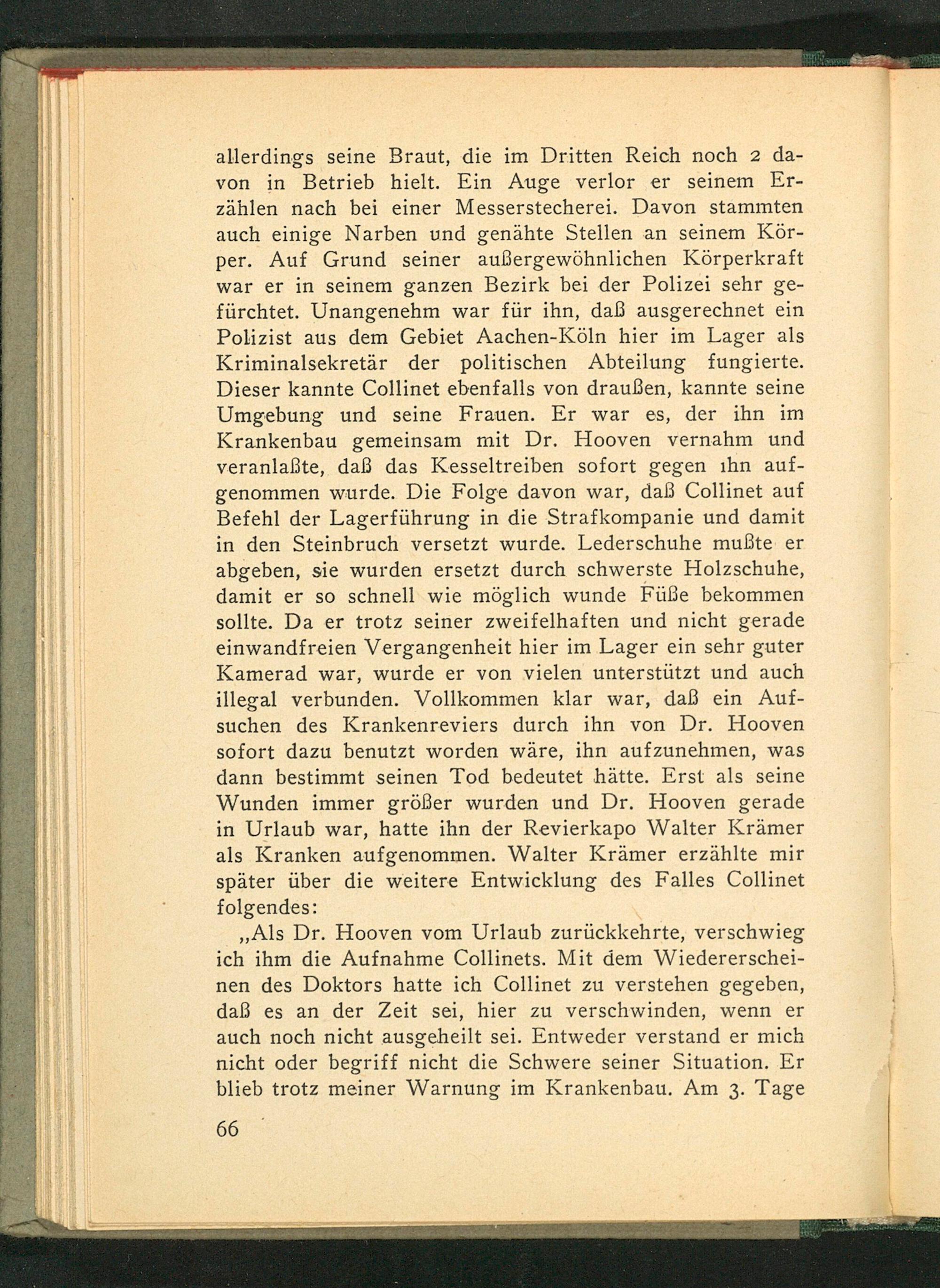 allerdings seine Braut, die im Dritten Reich noch 2 davon in Betrieb hielt. Ein Auge verlor er seinem Erzählen nach bei einer Messerstecherei. Davon stammten auch einige Narben und genähte Stellen an seinem Körper. Auf Grund seiner außergewöhnlichen Körperkraft war er in seinem ganzen Bezirk bei der Polizei sehr gefürchtet. Unangenehm war für ihn, daß ausgerechnet ein Polizist aus dem Gebiet Aachen- Köln hier im Lager als Kriminalsekretär der politischen Abteilung fungierte. Dieser kannte Collinet ebenfalls von draußen, kannte seine Umgebung und seine Frauen. Er war es, der ihn im Krankenbau gemeinsam mit Dr. Hooven vernahm und veranlaßte, daß das Kesseltreiben sofort gegen ihn aufgenommen wurde. Die Folge davon war, daß Collinet auf Befehl der Lagerführung in die Strafkompanie und damit in den Steinbruch versetzt wurde. Lederschuhe mußte er abgeben, sie wurden ersetzt durch schwerste Holzschuhe, damit er so schnell wie möglich wunde Füße bekommen sollte. Da er trotz seiner zweifelhaften und nicht gerade einwandfreien Vergangenheit hier im Lager ein sehr guter Kamerad war, wurde er von vielen unterstützt und auch illegal verbunden. Vollkommen klar war, daß ein Aufsuchen des Krankenreviers durch ihn von Dr. Hooven sofort dazu benutzt worden wäre, ihn aufzunehmen, was dann bestimmt seinen Tod bedeutet hätte. Erst als seine Wunden immer größer wurden und Dr. Hooven gerade in Urlaub war, hatte ihn der Revierkapo Walter Krämer als Kranken aufgenommen. Walter Krämer erzählte mir später über die weitere Entwicklung des Falles Collinet folgendes: