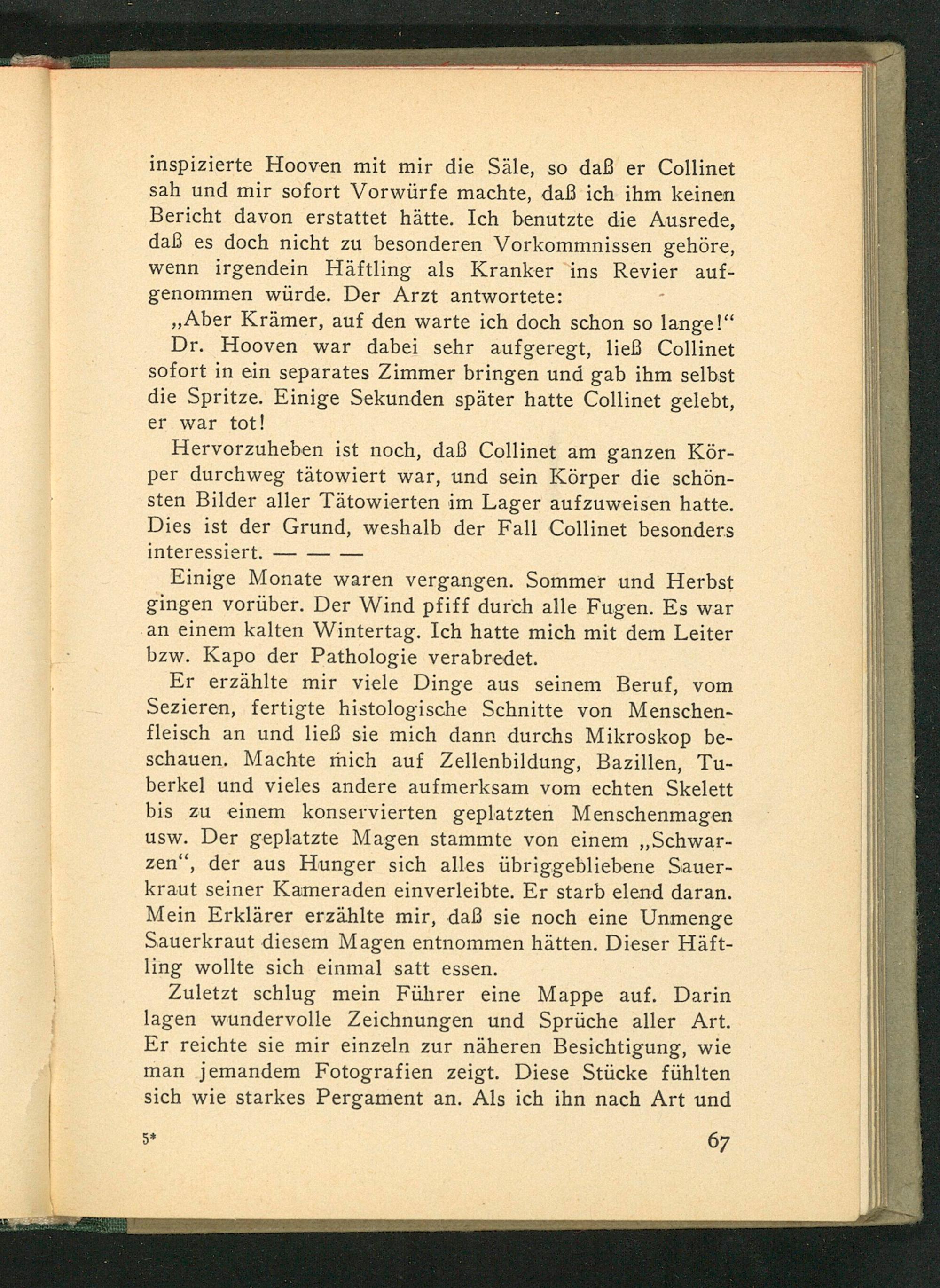 inspizierte Hooven mit mir die Säle, so daß er Collinet sah und mir sofort Vorwürfe machte, daß ich ihm keinen Bericht davon erstattet hätte. Ich benutzte die Ausrede, daß es doch nicht zu besonderen Vorkommnissen gehöre, wenn irgendein Häftling als Kranker ins Revier aufgenommen würde. Der Arzt antwortete: