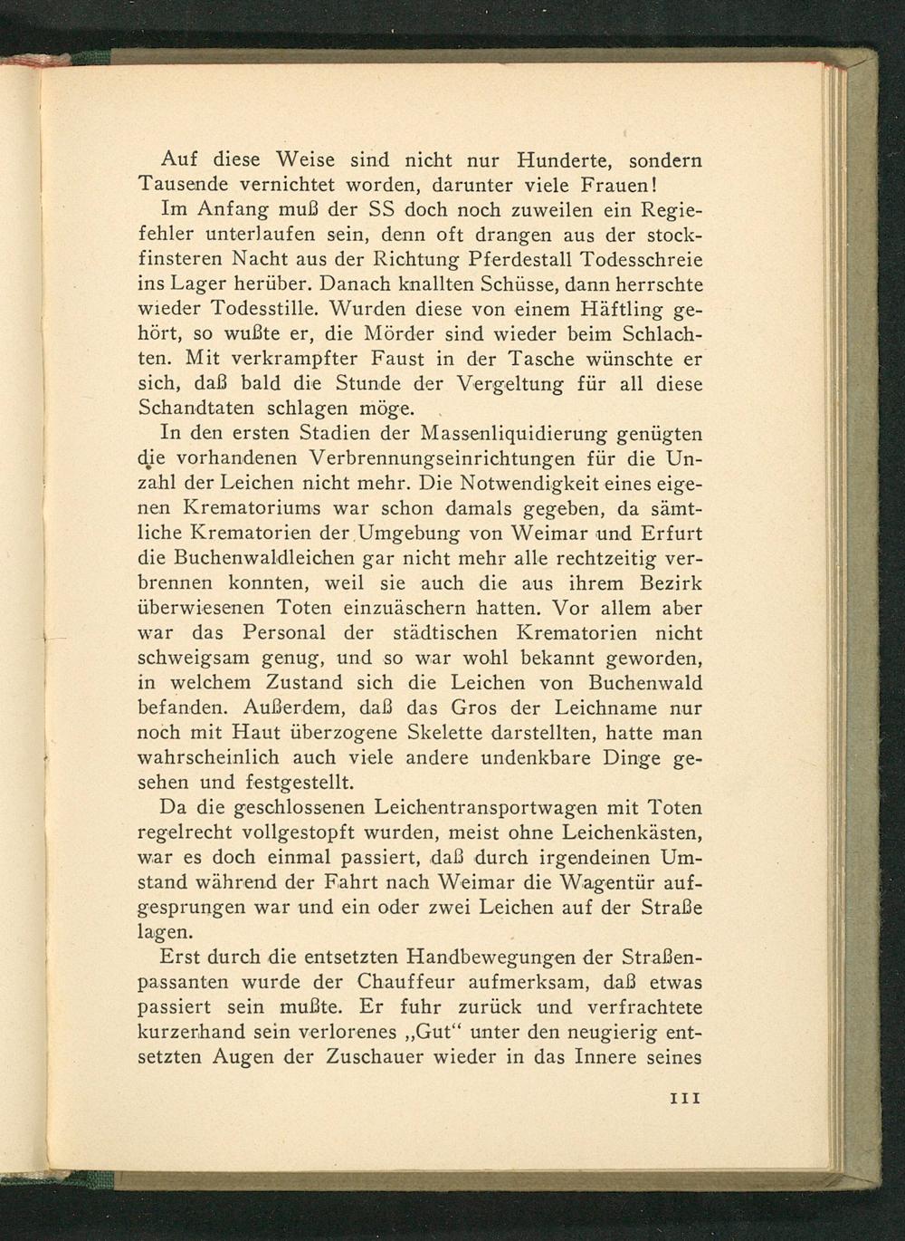Da die geschlossenen Leichentransportwagen mit Toten regelrecht vollgestopft wurden, meist ohne Leichenkästen, war es doch einmal passiert, daß durch irgendeinen Um- stand während der Fahrt nach Weimar die Wagentür auf- gesprungen war und ein oder zwei Leichen auf der Straße lagen.’