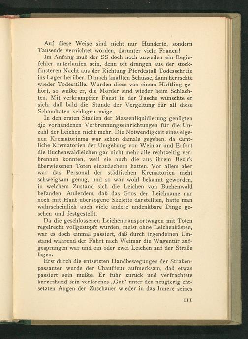 Da die geschlossenen Leichentransportwagen mit Toten regelrecht vollgestopft wurden, meist ohne Leichenkästen, war es doch einmal passiert, daß durch irgendeinen Um- stand während der Fahrt nach Weimar die Wagentür auf- gesprungen war und ein oder zwei Leichen auf der Straße lagen.’