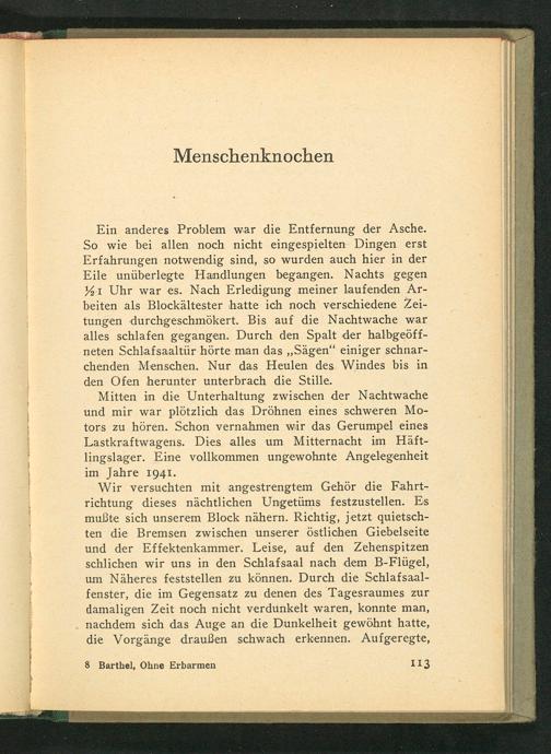 Ein anderes Problem war die Entfernung der Asche. So wie bei allen noch nicht eingespielten Dingen erst Erfahrungen notwendig sind, so wurden auch hier in der Eile unüberlegte Handlungen begangen. Nachts gegen 21 Uhr war es. Nach Erledigung meiner laufenden Arbeiten als Blockältester hatte ich noch verschiedene Zeitungen durchgeschmökert. Bis auf die Nachtwache war alles schlafen gegangen. Durch den Spalt der halbgeöffneten Schlafsaaltür hörte man das ,, Sägen" einiger schnarchenden Menschen. Nur das Heulen des Windes bis in den Ofen herunter unterbrach die Stille.