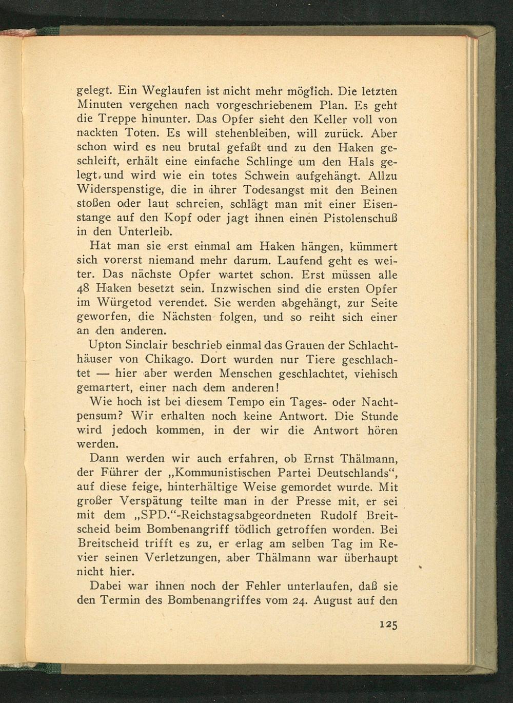 Dann werden wir auch erfahren, ob Ernst Thälmann , der Führer der„Kommunistischen Partei Deutschlands “, auf diese feige, hinterhältige Weise gemordet wurde. Mit großer Verspätung teilte man in der Presse mit, er sei mit dem„SPD.“-Reichstagsabgeordneten Rudolf Breit- scheid beim Bombenangriff tödlich getroffen worden. Bei Breitscheid trifft es zu, er erlag am selben Tag im Re- vier seinen Verletzungen, aber Thälmann war überhaupt nicht hier.