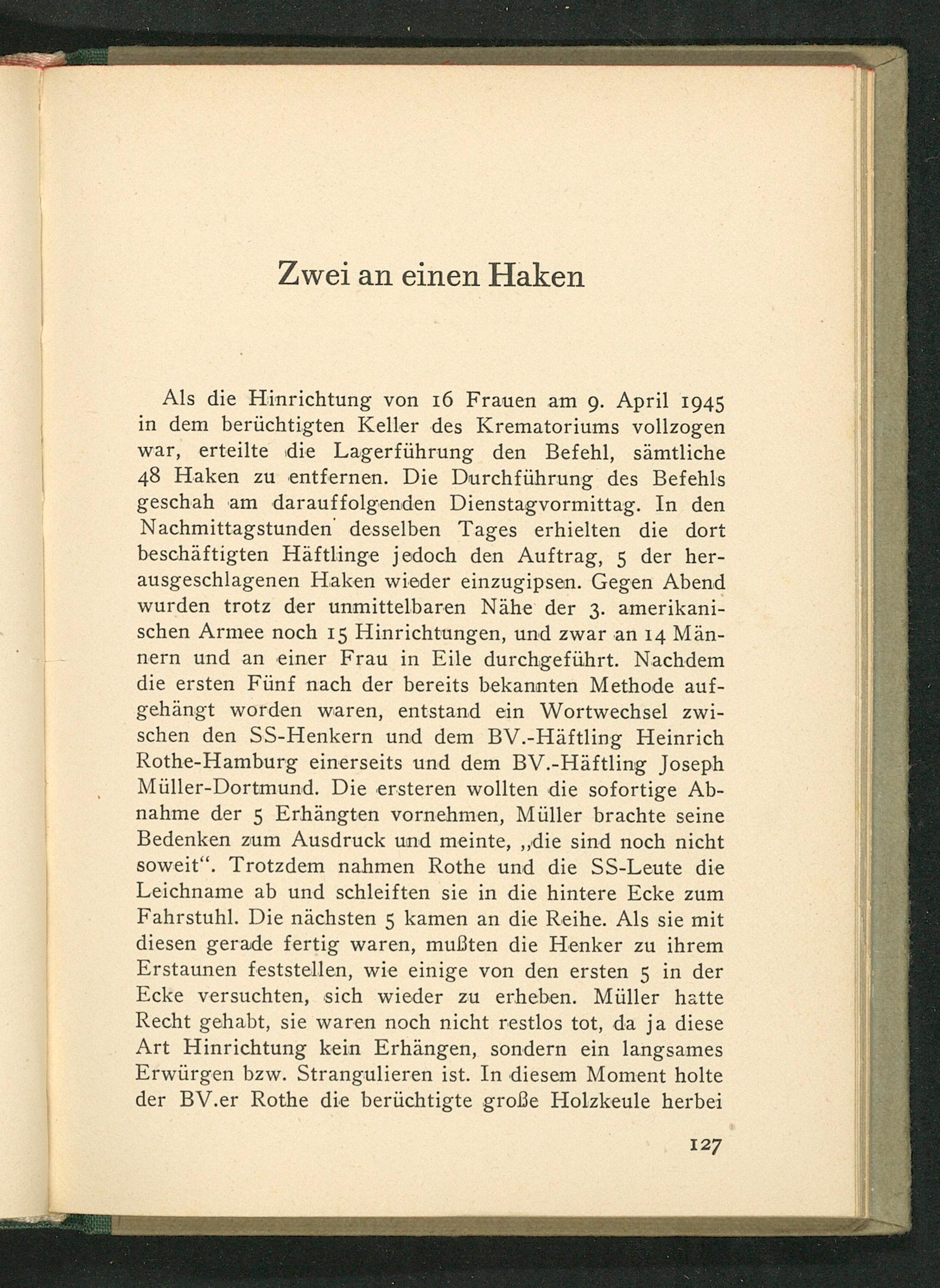 Als die Hinrichtung von 16 Frauen am 9. April 1945 in dem berüchtigten Keller des Krematoriums vollzogen war, erteilte die Lagerführung den Befehl, sämtliche 48 Haken zu entfernen. Die Durchführung des Befehls geschah am darauffolgenden Dienstagvormittag. In den Nachmittagstunden desselben Tages erhielten die dort beschäftigten Häftlinge jedoch den Auftrag, 5 der herausgeschlagenen Haken wieder einzugipsen. Gegen Abend wurden trotz der unmittelbaren Nähe der 3. amerikanischen Armee noch 15 Hinrichtungen, und zwar an 14 Männern und an einer Frau in Eile durchgeführt. Nachdem die ersten Fünf nach der bereits bekannten Methode aufgehängt worden waren, entstand ein Wortwechsel zwischen den SS - Henkern und dem BV.- Häftling Heinrich Rothe- Hamburg einerseits und dem BV.- Häftling Joseph Müller- Dortmund . Die ersteren wollten die sofortige Abnahme der 5 Erhängten vornehmen, Müller brachte seine Bedenken zum Ausdruck und meinte ,,, die sind noch nicht soweit". Trotzdem nahmen Rothe und die SS - Leute die Leichname ab und schleiften sie in die hintere Ecke zum Fahrstuhl. Die nächsten 5 kamen an die Reihe. Als sie mit diesen gerade fertig waren, mußten die Henker zu ihrem Erstaunen feststellen, wie einige von den ersten 5 in der Ecke versuchten, sich wieder zu erheben. Müller hatte Recht gehabt, sie waren noch nicht restlos tot, da ja diese Art Hinrichtung kein Erhängen, sondern ein langsames Erwürgen bzw. Strangulieren ist. In diesem Moment holte der BV.er Rothe die berüchtigte große Holzkeule herbei