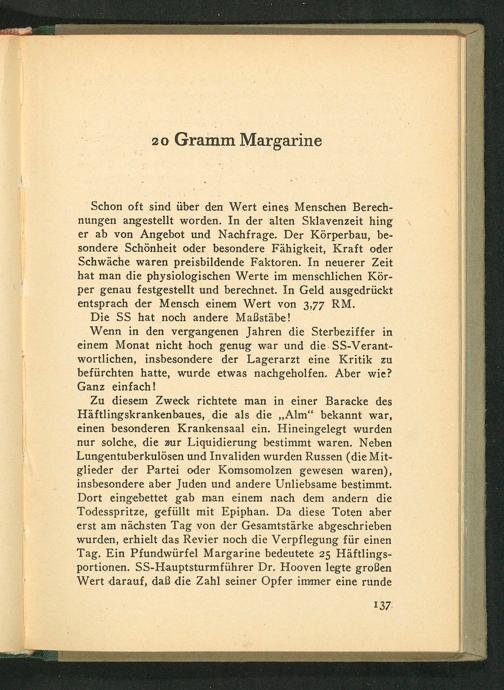 Zu diesem Zweck richtete man in einer Baracke des Häftlingskrankenbaues, die als die ‚Alm‘ bekannt war, einen besonderen Krankensaal ein. Hineingelegt wurden nur solche, die zur Liquidierung bestimmt waren. Neben Lungentuberkulösen und Invaliden wurden Russen(die Mit- glieder der Partei oder Komsomolzen gewesen waren), insbesondere aber Juden und andere Unliebsame bestimmt. Dort eingebettet gab man einem nach dem andern die Todesspritze, gefüllt mit Epiphan. Da diese Toten aber erst am nächsten Tag von der Gesamtstärke abgeschrieben wurden, erhielt das Revier noch die Verpflegung für einen Tag. Ein Pfundwürfel Margarine bedeutete 25 Häftlings- portionen. SS-Hauptsturmführer Dr. Hooven legte großen Wert darauf, daß die Zahl seiner Opfer immer eine runde