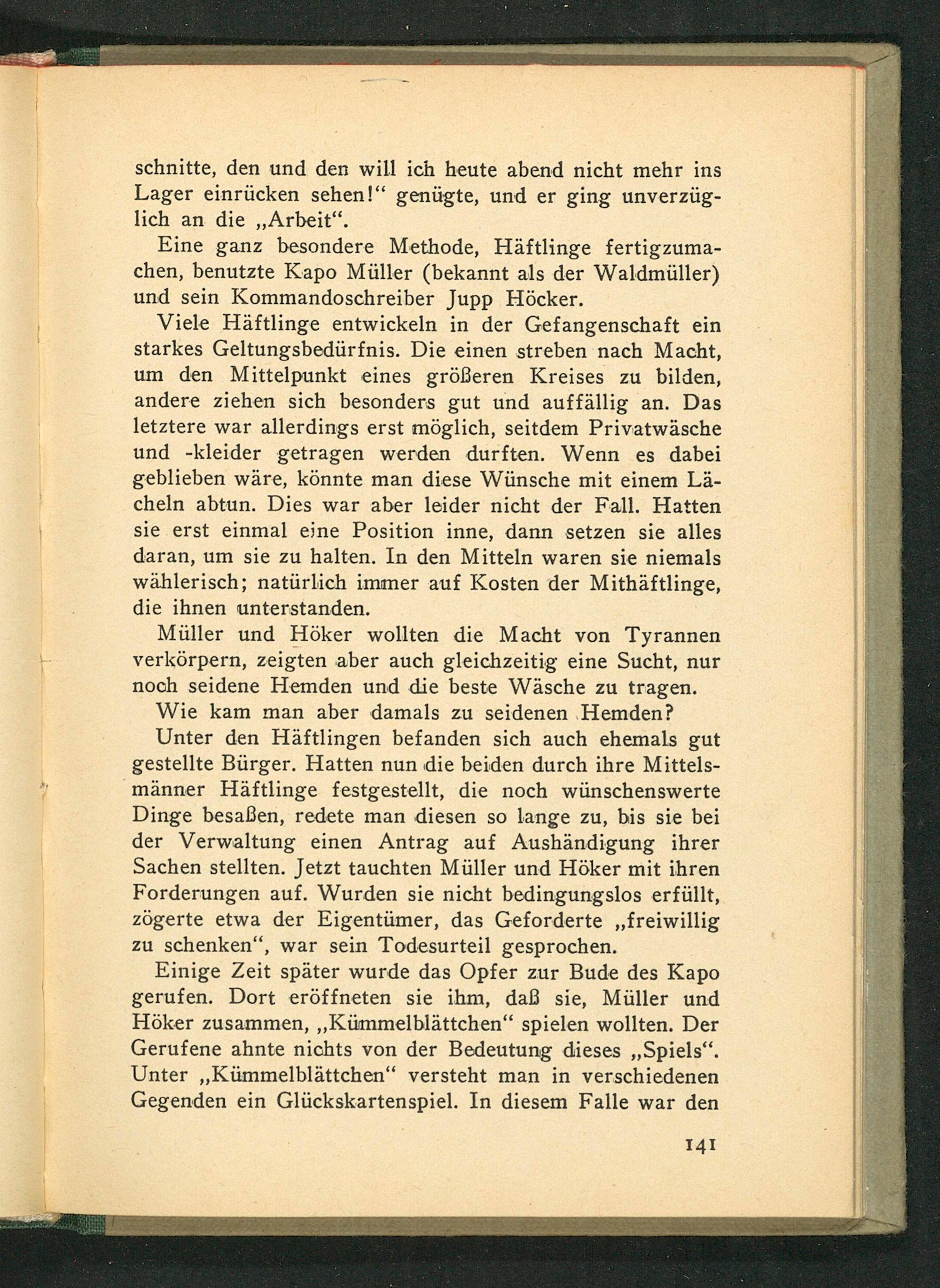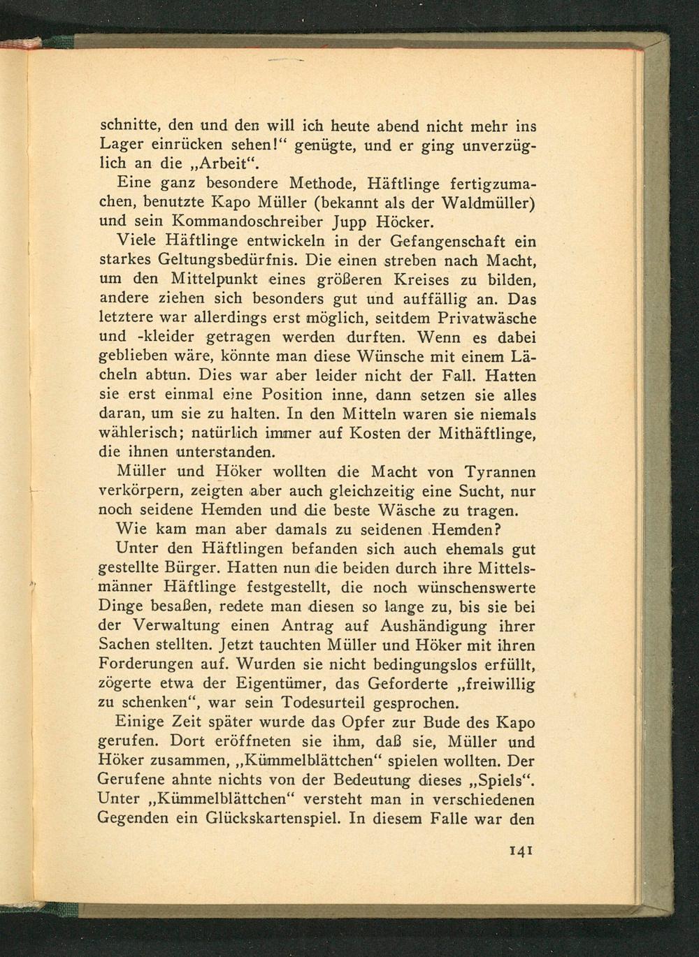Einige Zeit später wurde das Opfer zur Bude des Kapo gerufen. Dort eröffneten sie ihm, daß sie, Müller und Höker zusammen ,,, Kümmelblättchen" spielen wollten. Der Gerufene ahnte nichts von der Bedeutung dieses ,, Spiels". Unter ,, Kümmelblättchen" versteht man in verschiedenen Gegenden ein Glückskartenspiel. In diesem Falle war den
