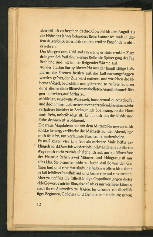 Mühfelige, ungewiffe Wartezeit, hundertmal durchgekoftet und doch immer aufs neue nervenzerreißend, langfame, fehr verspätete Einfahrt in Berlin , müde Spannung, ob das Haus noch steht, unbefchädigt ift. Es ist noch da; die Kühle und Ruhe drinnen ist wohltuend.