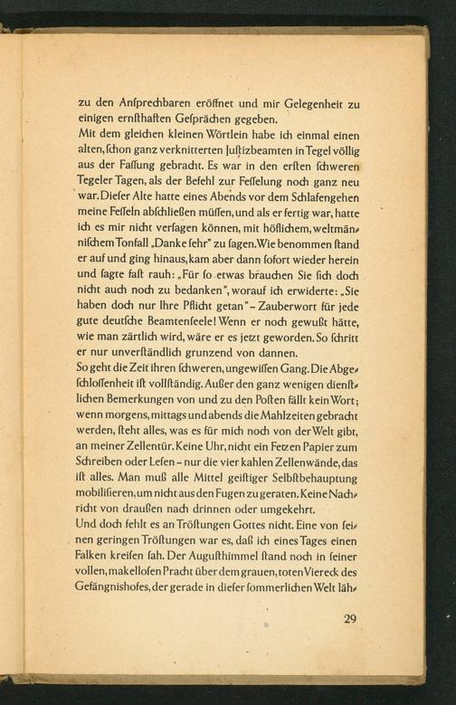 Und doch fehlt es an Tröftungen Gottes nicht. Eine von fei nen geringen Tröftungen war es, daß ich eines Tages einen Falken kreifen fah. Der Augufthimmel ftand noch in feiner vollen, makellofen Pracht über dem grauen, toten Viereck des Gefängnishofes, der gerade in diefer fommerlichen Welt läh