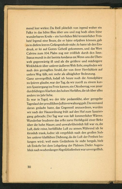 Es war in Tegel , wo der fehr pedantifche, aber geregelte Tageslauf der preußischen Juftizverwaltung galt. Da niemand daran gedacht hatte, das Gegenteil anzuordnen, wurden wir nach der Hausordnung früh auf den Hof zum Spazier gang gebracht. Der Tag war von faft fommerlicher Wärme. Wunderbar leuchtete das erfte zarte Herbftgold einer Birke über die hohe Mauer, und unwahrscheinlich füß war es, die Luft, diefe reine, herbftliche Luft zu atmen. Während ich fie förmlich trank, fuchte ich vergeblich nach den großen Stel len unferer klaffifchen Dichtung, da die Luft der Freiheit be fungen wird;' weil mein Gedächtnis fie nicht hergab, hielt ich Einkehr bei dem Lobgefang der Pfalmen. Diefer Augenblick nach wochenlanger Abgefchloffenheit war unvergeßlich.