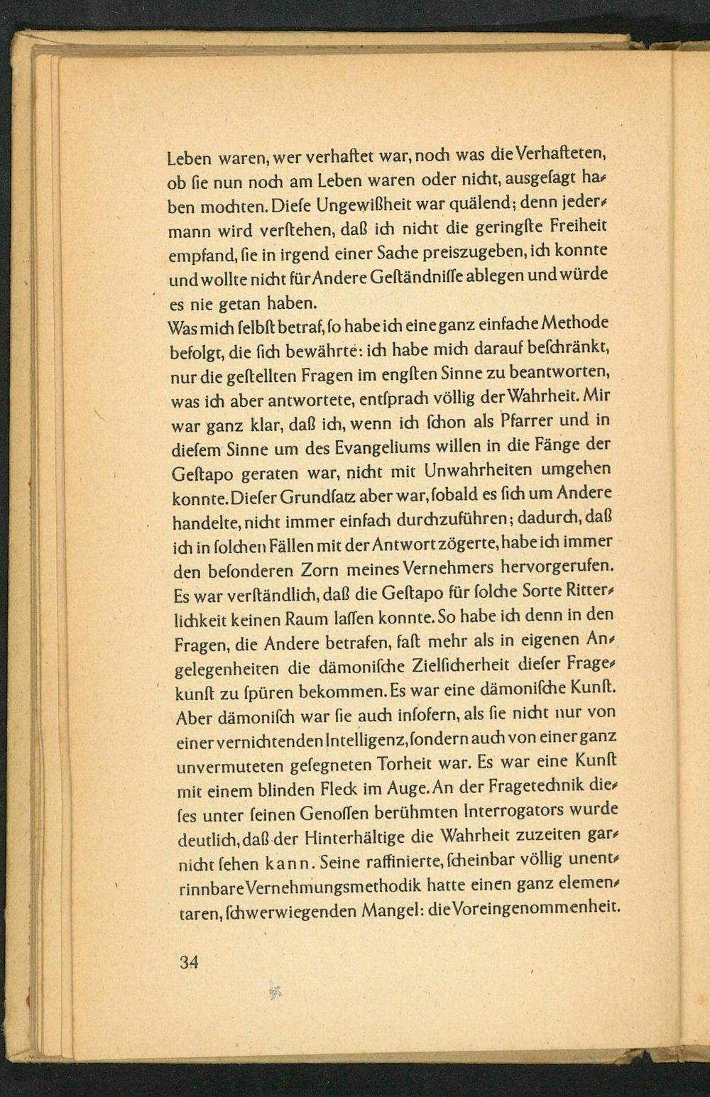 Was mich felbft betraf, fo habe ich eine ganz einfache Methode befolgt, die fich bewährte: ich habe mich darauf beschränkt, nur die geftellten Fragen im engften Sinne zu beantworten, was ich aber antwortete, entſprach völlig der Wahrheit. Mir war ganz klar, daß ich, wenn ich schon als Pfarrer und in diefem Sinne um des Evangeliums willen in die Fänge der Geftapo geraten war, nicht mit Unwahrheiten umgehen konnte. Diefer Grundfatz aber war, fobald es fich um Andere handelte, nicht immer einfach durchzuführen; dadurch, daß ich in folchen Fällen mit der Antwort zögerte, habe ich immer den befonderen Zorn meines Vernehmers hervorgerufen. Es war verſtändlich, daß die Geftapo für folche Sorte Ritter lichkeit keinen Raum laffen konnte. So habe ich denn in den Fragen, die Andere betrafen, faft mehr als in eigenen An gelegenheiten die dämonifche Zielficherheit diefer Frage kunft zu spüren bekommen. Es war eine dämonische Kunft. Aber dämoniſch war fie auch infofern, als fie nicht nur von einer vernichtenden Intelligenz, fondern auch von einer ganz unvermuteten gefegneten Torheit war. Es war eine Kunft mit einem blinden Fleck im Auge. An der Fragetechnik die fes unter feinen Genoffen berühmten Interrogators wurde deutlich, daß der Hinterhältige die Wahrheit zuzeiten gar nicht fehen kann. Seine raffinierte, fcheinbar völlig unents rinnbare Vernehmungsmethodik hatte einen ganz elemen taren, fchwerwiegenden Mangel: die Voreingenommenheit.
