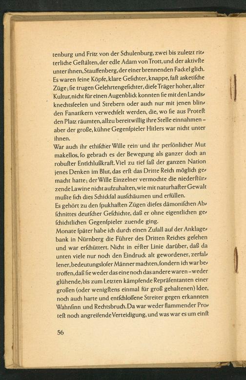 tenburg und Fritz von der Schulenburg , zwei bis zuletzt rit terliche Geftalten, der edle Adam von Trott , und der aktivfte unter ihnen, Stauffenberg , der einer brennenden Fackel glich. Es waren feine Köpfe, klare Gefichter, knappe, faft asketiſche Züge; fie trugen Gelehrtengefichter, diefe Träger hoher, alter Kultur, nicht für einen Augenblick konnten fie mit den Lands knechtsfeelen und Strebern oder auch nur mit jenen blin den Fanatikern verwechfelt werden, die, wo fie aus Proteft den Platz räumten, allzu bereitwillig ihre Stelle einnahmen- aber der große, kühne Gegenfpieler Hitlers war nicht unter ihnen.