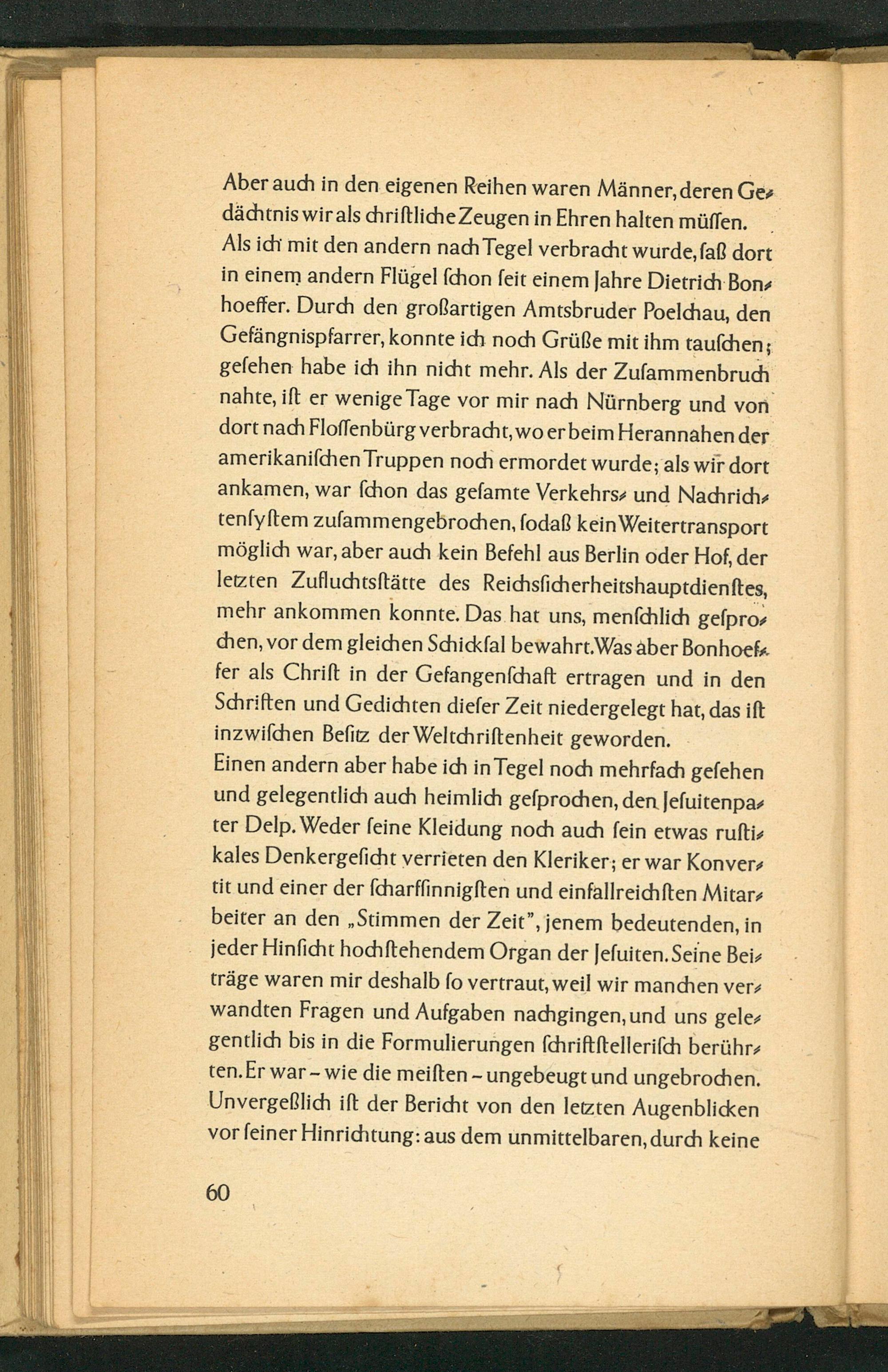 Aber auch in den eigenen Reihen waren Männer, deren Ge dächtnis wir als chriftliche Zeugen in Ehren halten müffen. Als ich mit den andern nach Tegel verbracht wurde, faẞ dort in einem andern Flügel fchon feit einem Jahre Dietrich Bon hoeffer. Durch den großartigen Amtsbruder Poelchau, den Gefängnispfarrer, konnte ich noch Grüße mit ihm tauſchen; gefehen habe ich ihn nicht mehr. Als der Zuſammenbruch nahte, ift er wenige Tage vor mir nach Nürnberg und von dort nach Floffenbürg verbracht, wo er beim Herannahen der amerikaniſchen Truppen noch ermordet wurde; als wir dort ankamen, war schon das gefamte Verkehrs- und Nachrich tenfyftem zufammengebrochen, fodaß kein Weitertransport möglich war, aber auch kein Befehl aus Berlin oder Hof, der letzten Zufluchtsftätte des Reichsficherheitshauptdienftes, mehr ankommen konnte. Das hat uns, menfchlich gefpro chen, vor dem gleichen Schickfal bewahrt.Was aber Bonhoef fer als Chrift in der Gefangenfchaft ertragen und in den Schriften und Gedichten diefer Zeit niedergelegt hat, das ift inzwifchen Befitz der Weltchriftenheit geworden. Einen andern aber habe ich in Tegel noch mehrfach gefehen und gelegentlich auch heimlich gefprochen, den Jefuitenpa ter Delp. Weder feine Kleidung noch auch fein etwas rufti kales Denkergeficht verrieten den Kleriker; er war Konver tit und einer der fcharffinnigften und einfallreichften Mitar beiter an den„ Stimmen der Zeit ", jenem bedeutenden, in jeder Hinficht hochftehendem Organ der Jefuiten. Seine Bei träge waren mir deshalb fo vertraut, weil wir manchen ver wandten Fragen und Aufgaben nachgingen, und uns gele gentlich bis in die Formulierungen fchriftftellerifch berühr ten. Er war wie die meiſten- ungebeugt und ungebrochen. Unvergeßlich ift der Bericht von den letzten Augenblicken vor feiner Hinrichtung: aus dem unmittelbaren, durch keine