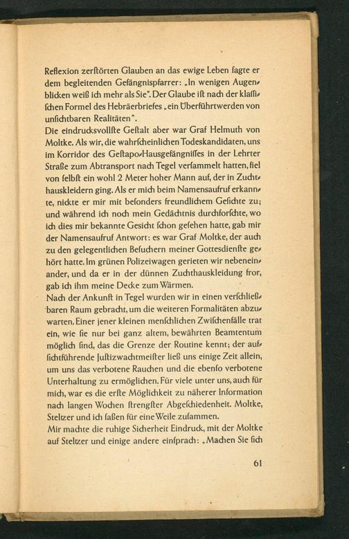 Die eindrucksvollfte Geftalt aber war Graf Helmuth von Moltke. Als wir, die wahrscheinlichen Todeskandidaten, uns im Korridor des Geftapo- Hausgefängniffes in der Lehrter Straße zum Abtransport nach Tegel verfammelt hatten, fiel von felbft ein wohl 2 Meter hoher Mann auf, der in Zucht hauskleidern ging. Als er mich beim Namensaufruf erkann te, nickte er mir mit befonders freundlichem Gefichte zu; und während ich noch mein Gedächtnis durchforschte, wo ich dies mir bekannte Gesicht fchon gefehen hatte, gab mir der Namensaufruf Antwort: es war Graf Moltke, der auch zu den gelegentlichen Befuchern meiner Gottesdienfte ges hört hatte. Im grünen Polizeiwagen gerieten wir nebenein ander, und da er in der dünnen Zuchthauskleidung fror, gab ich ihm meine Decke zum Wärmen.
