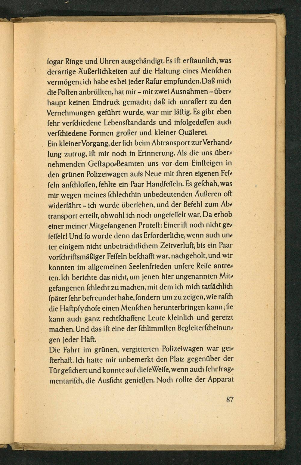 fogar Ringe und Uhren ausgehändigt. Es ift erftaunlich, was derartige Äußerlichkeiten auf die Haltung eines Menschen vermögen; ich habe es bei jeder Rafur empfunden. Daß mich die Poften anbrüllten, hat mir- mit zwei Ausnahmen- über haupt keinen Eindruck gemacht; daß ich unraffert zu den Vernehmungen geführt wurde, war mir läftig. Es gibt eben fehr verfchiedene Lebensftandards und infolgedeffen auch verfchiedene Formen großer und kleiner Quälerei.