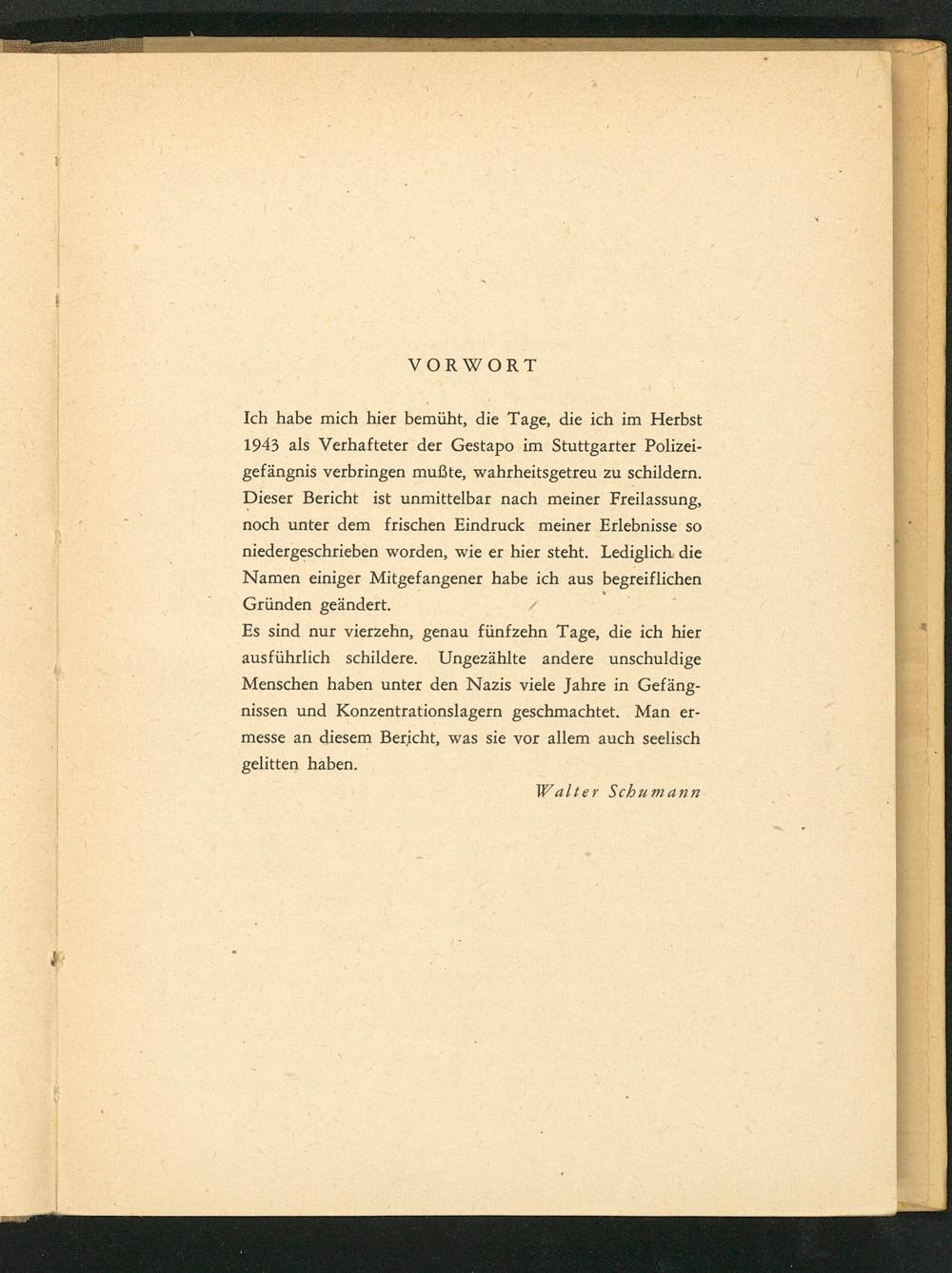 Ich habe mich hier bemüht, die Tage, die ich im Herbst 1943 als Verhafteter der Gestapo im Stuttgarter Polizeigefängnis verbringen mußte, wahrheitsgetreu zu schildern. Dieser Bericht ist unmittelbar nach meiner Freilassung, noch unter dem frischen Eindruck meiner Erlebnisse so niedergeschrieben worden, wie er hier steht. Lediglich die Namen einiger Mitgefangener habe ich aus begreiflichen Gründen geändert.