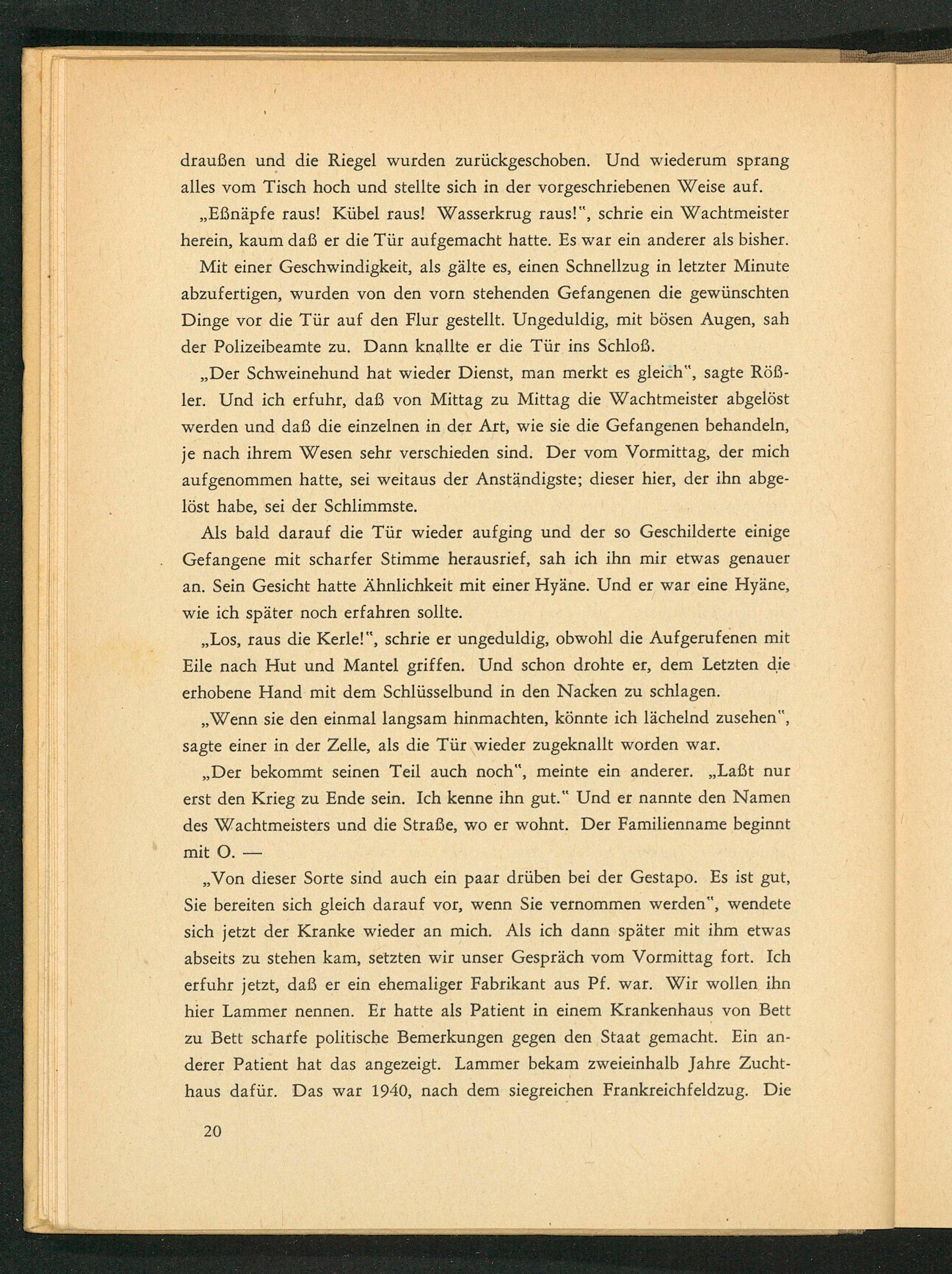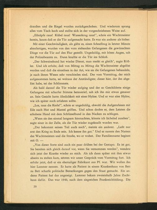 ,, Von dieser Sorte sind auch ein paar drüben bei der Gestapo . Es ist gut, Sie bereiten sich gleich darauf vor, wenn Sie vernommen werden", wendete sich jetzt der Kranke wieder an mich. Als ich dann später mit ihm etwas abseits zu stehen kam, setzten wir unser Gespräch vom Vormittag fort. Ich erfuhr jetzt, daß er ein ehemaliger Fabrikant aus Pf. war. Wir wollen ihn hier Lammer nennen. Er hatte als Patient in einem Krankenhaus von Bett zu Bett scharfe politische Bemerkungen gegen den Staat gemacht. Ein anderer Patient hat das angezeigt. Lammer bekam zweieinhalb Jahre Zuchthaus dafür. Das war 1940, nach dem siegreichen Frankreichfeldzug. Die