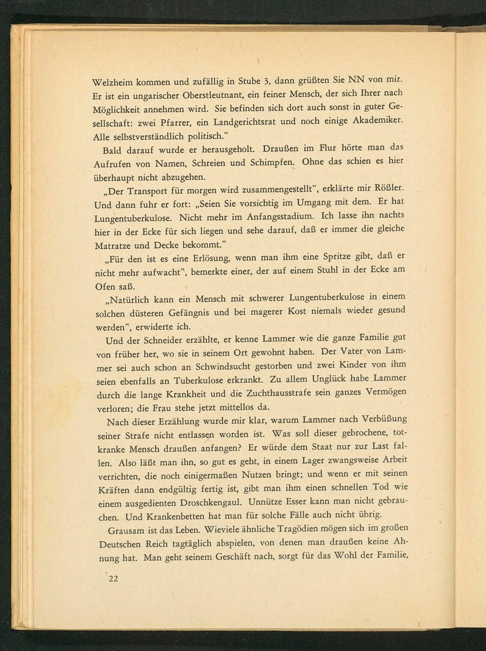 Und der Schneider erzählte, er kenne Lammer wie die ganze Familie gut von früher her, wo sie in seinem Ort gewohnt haben. Der Vater von Lammer sei auch schon an Schwindsucht gestorben und zwei Kinder von ihm seien ebenfalls an Tuberkulose erkrankt. Zu allem Unglück habe Lammer durch die lange Krankheit und die Zuchthausstrafe sein ganzes Vermögen verloren; die Frau stehe jetzt mittellos da.