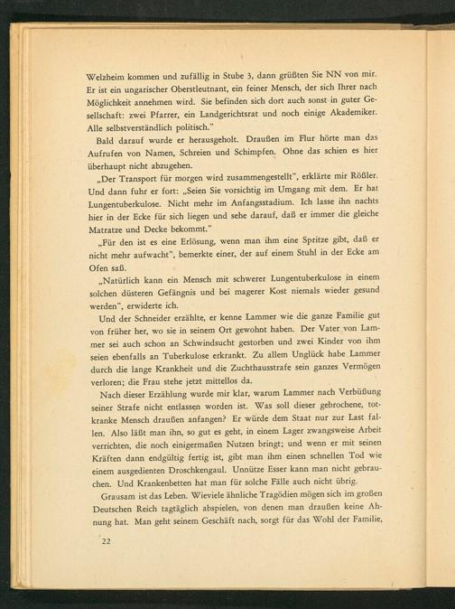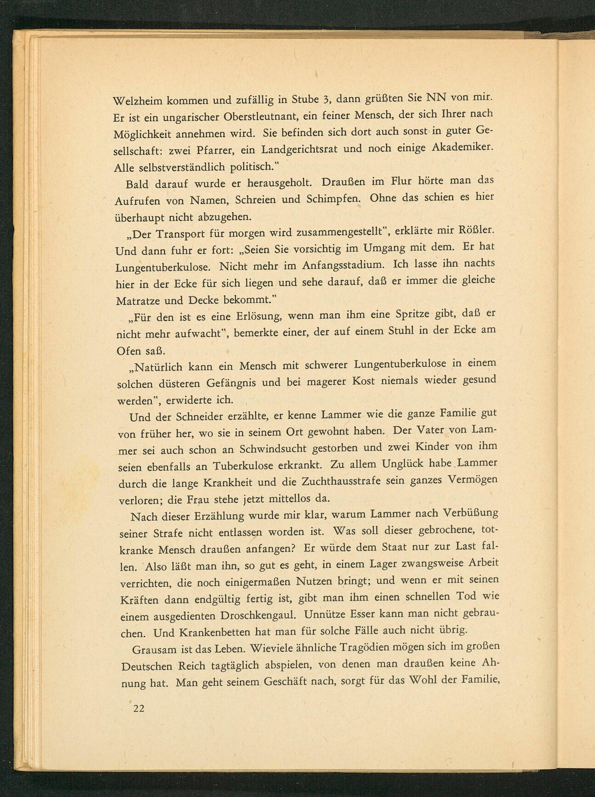 „ Der Transport für morgen wird zusammengestellt", erklärte mir Rößler. Und dann fuhr er fort:„ Seien Sie vorsichtig im Umgang mit dem. Er hat Lungentuberkulose. Nicht mehr im Anfangsstadium. Ich lasse ihn nachts hier in der Ecke für sich liegen und sehe darauf, daß er immer die gleiche Matratze und Decke bekommt."