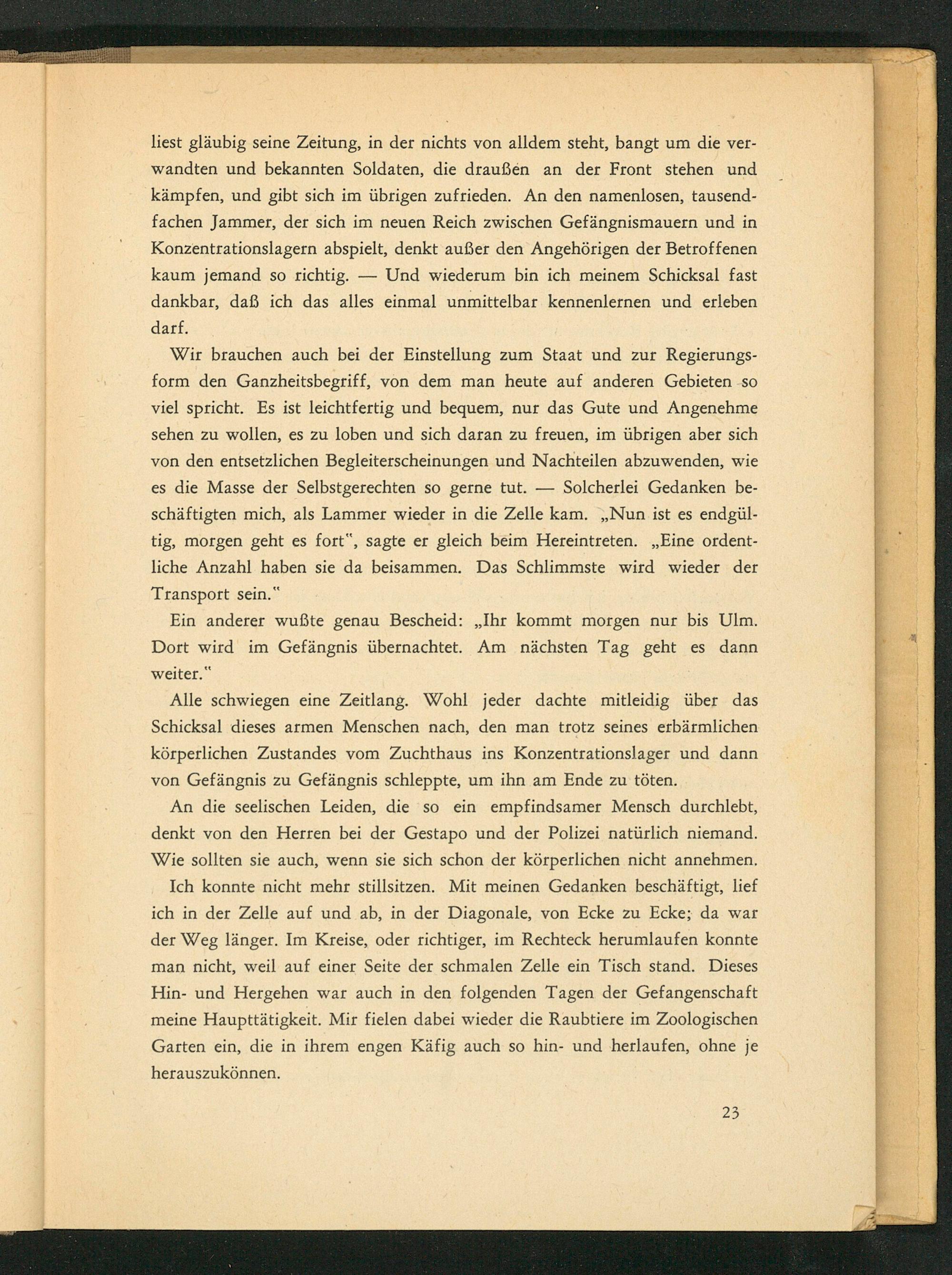 Wir brauchen auch bei der Einstellung zum Staat und zur Regierungsform den Ganzheitsbegriff, von dem man heute auf anderen Gebieten so viel spricht. Es ist leichtfertig und bequem, nur das Gute und Angenehme sehen zu wollen, es zu loben und sich daran zu freuen, im übrigen aber sich von den entsetzlichen Begleiterscheinungen und Nachteilen abzuwenden, wie es die Masse der Selbstgerechten so gerne tut. Solcherlei Gedanken beschäftigten mich, als Lammer wieder in die Zelle kam. ,, Nun ist es endgültig, morgen geht es fort", sagte er gleich beim Hereintreten.„ Eine ordentliche Anzahl haben sie da beisammen. Das Schlimmste wird wieder der Transport sein.“