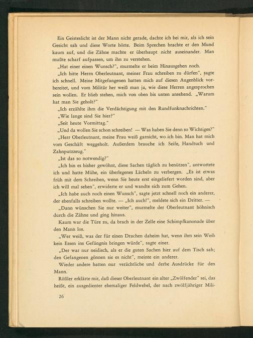 „Ich bitte Hertn Oberleutnant, meiner Frau schreiben zu dürfen“, sagte ich schnell. Meine Mitgefangenen hatten mich auf diesen Augenblick vor- bereitet, und vom Militär her weiß man ja, wie diese Herren angesprochen sein wollen. Er blieb stehen, mich von oben bis unten ansehend.„Warum hat man Sie geholt?“
