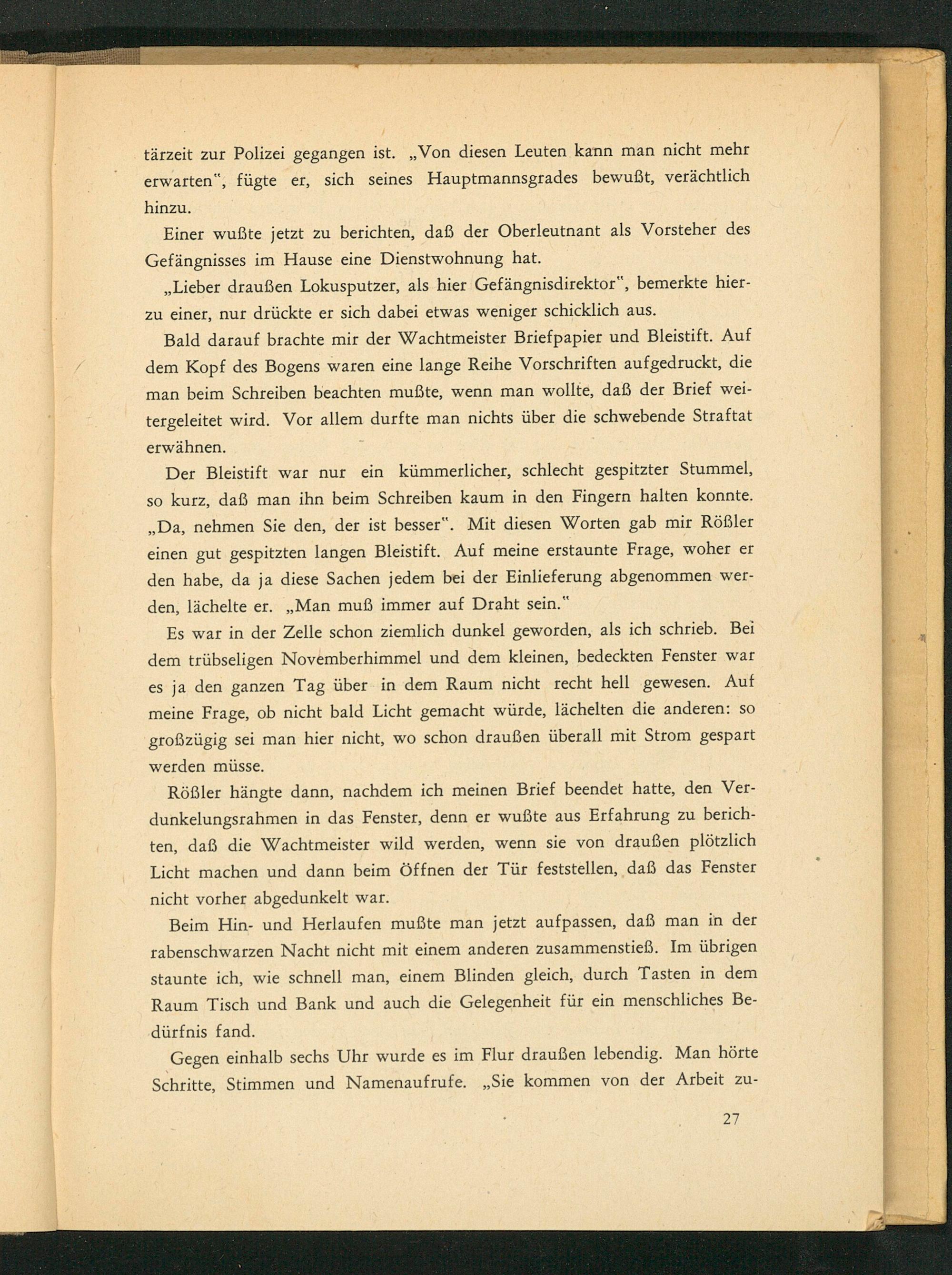 Es war in der Zelle schon ziemlich dunkel geworden, als ich schrieb. Bei dem trübseligen Novemberhimmel und dem kleinen, bedeckten Fenster war es ja den ganzen Tag über in dem Raum nicht recht hell gewesen. Auf meine Frage, ob nicht bald Licht gemacht würde, lächelten die anderen: so großzügig sei man hier nicht, wo schon draußen überall mit Strom gespart werden müsse.