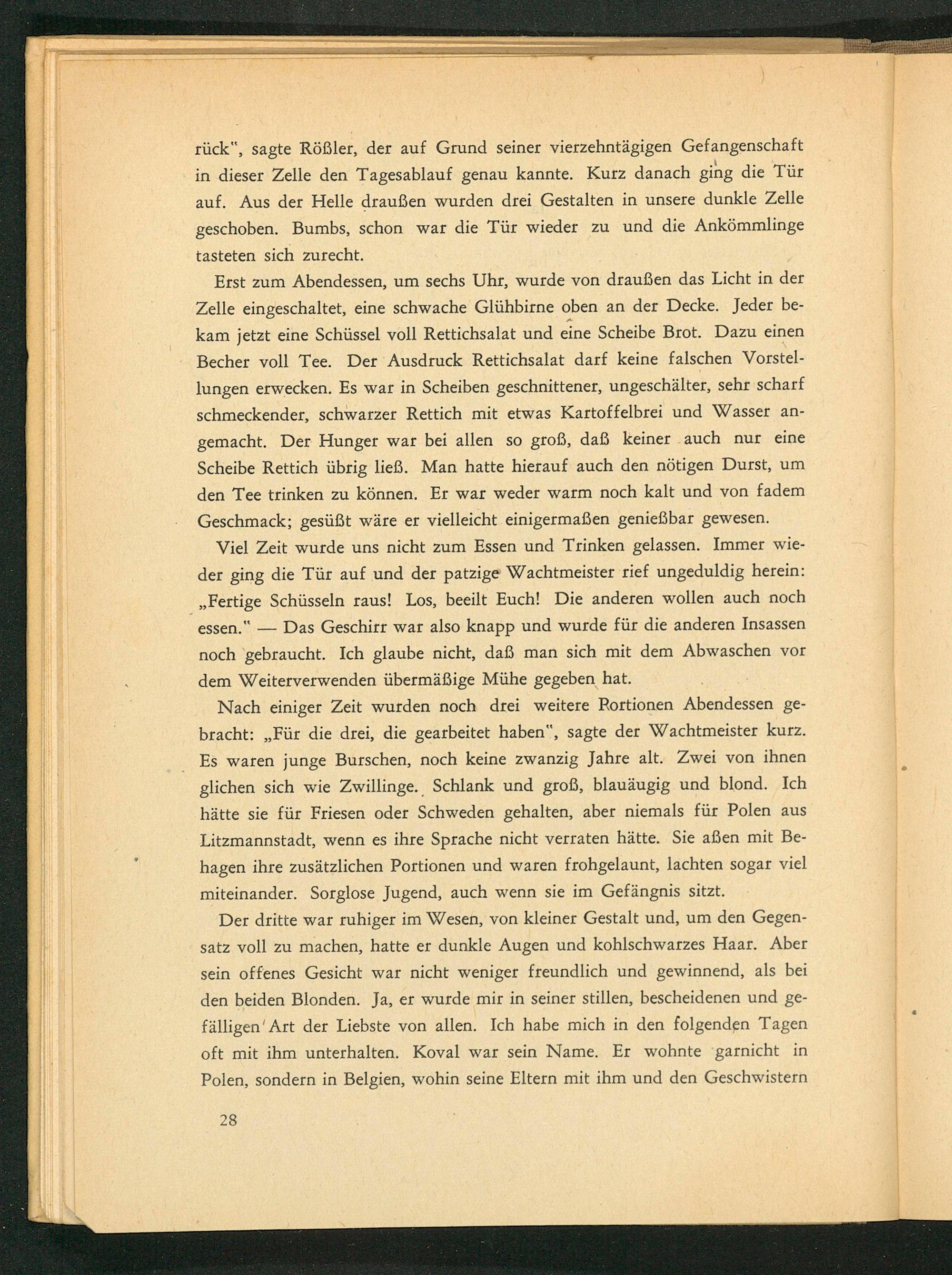 Nach einiger Zeit wurden noch drei weitere Rortionen Abendessen gebracht:„ Für die drei, die gearbeitet haben", sagte der Wachtmeister kurz. Es waren junge Burschen, noch keine zwanzig Jahre alt. Zwei von ihnen glichen sich wie Zwillinge. Schlank und groß, blauäugig und blond. Ich hätte sie für Friesen oder Schweden gehalten, aber niemals für Polen aus Litzmannstadt, wenn es ihre Sprache nicht verraten hätte. Sie aẞen mit Behagen ihre zusätzlichen Portionen und waren frohgelaunt, lachten sogar viel miteinander. Sorglose Jugend, auch wenn sie im Gefängnis sitzt.