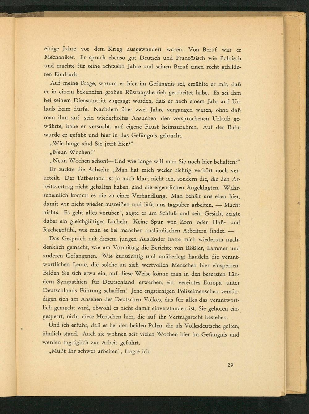 Und ich erfuhr, daß es bei den beiden Polen , die als Volksdeutsche gelten, ähnlich stand. Auch sie wohnen seit vielen Wochen hier im Gefängnis und werden tagtäglich zur Arbeit geführt.