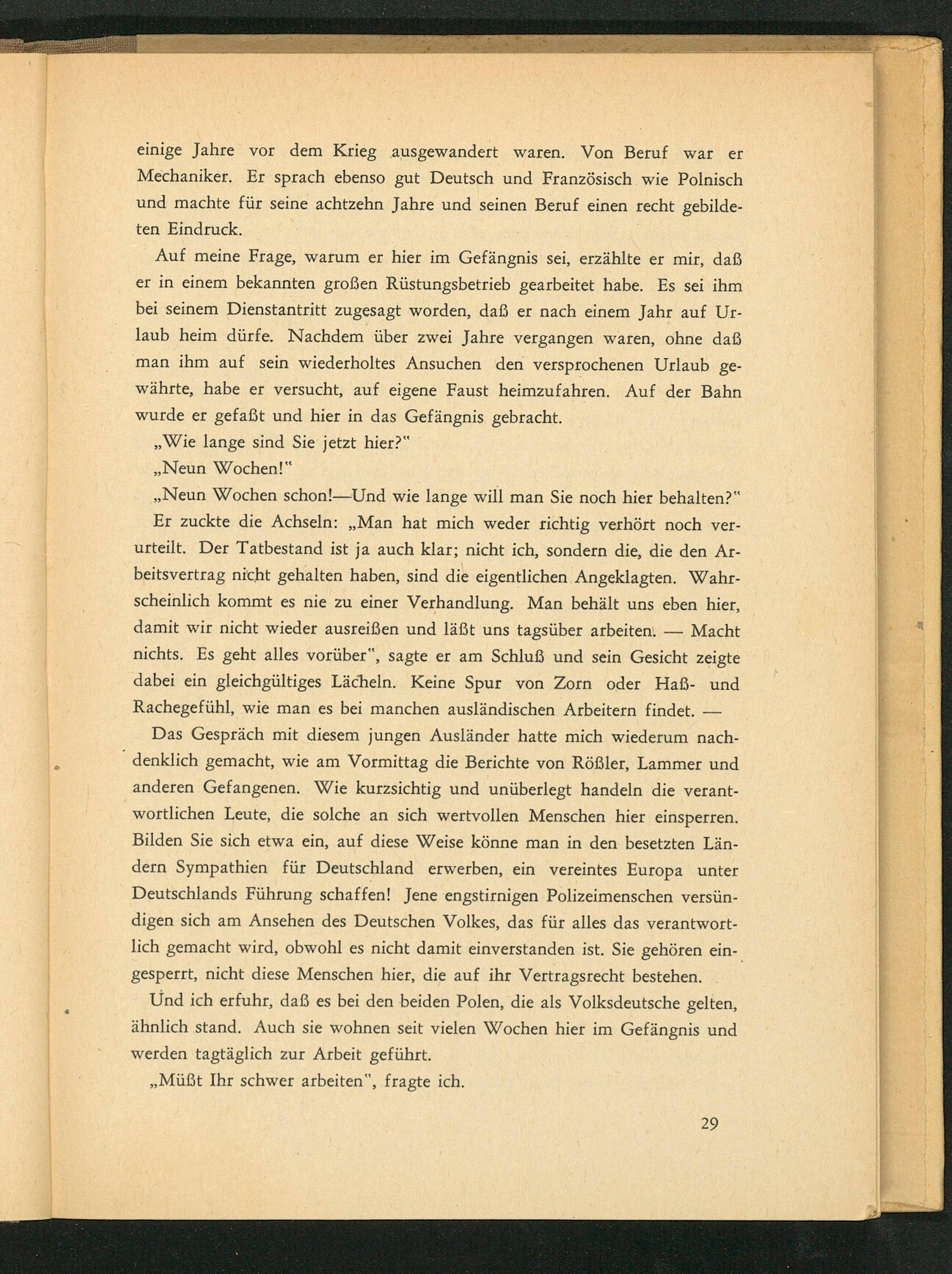 Auf meine Frage, warum er hier im Gefängnis sei, erzählte er mir, daß er in einem bekannten großen Rüstungsbetrieb gearbeitet habe. Es sei ihm bei seinem Dienstantritt zugesagt worden, daß er nach einem Jahr auf Urlaub heim dürfe. Nachdem über zwei Jahre vergangen waren, ohne daß man ihm auf sein wiederholtes Ansuchen den versprochenen Urlaub gewährte, habe er versucht, auf eigene Faust heimzufahren. Auf der Bahn wurde er gefaßt und hier in das Gefängnis gebracht.