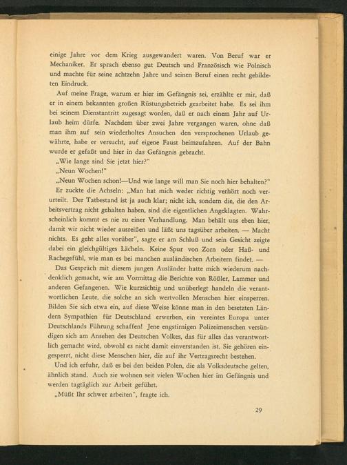 Das Gespräch mit diesem jungen Ausländer hatte mich wiederum nachdenklich gemacht, wie am Vormittag die Berichte von Rößler, Lammer und anderen Gefangenen. Wie kurzsichtig und unüberlegt handeln die verantwortlichen Leute, die solche an sich wertvollen Menschen hier einsperren. Bilden Sie sich etwa ein, auf diese Weise könne man in den besetzten Ländern Sympathien für Deutschland erwerben, ein vereintes Europa unter Deutschlands Führung schaffen! Jene engstirnigen Polizeimenschen versündigen sich am Ansehen des Deutschen Volkes, das für alles das verantwortlich gemacht wird, obwohl es nicht damit einverstanden ist. Sie gehören eingesperrt, nicht diese Menschen hier, die auf ihr Vertragsrecht bestehen.