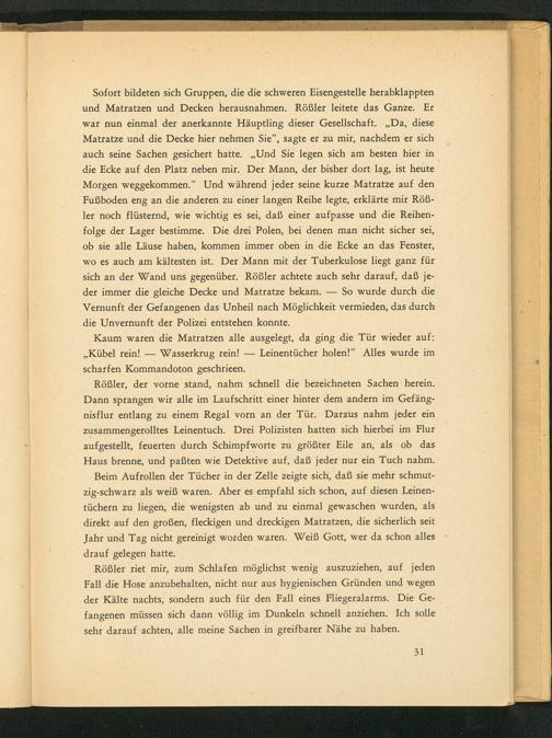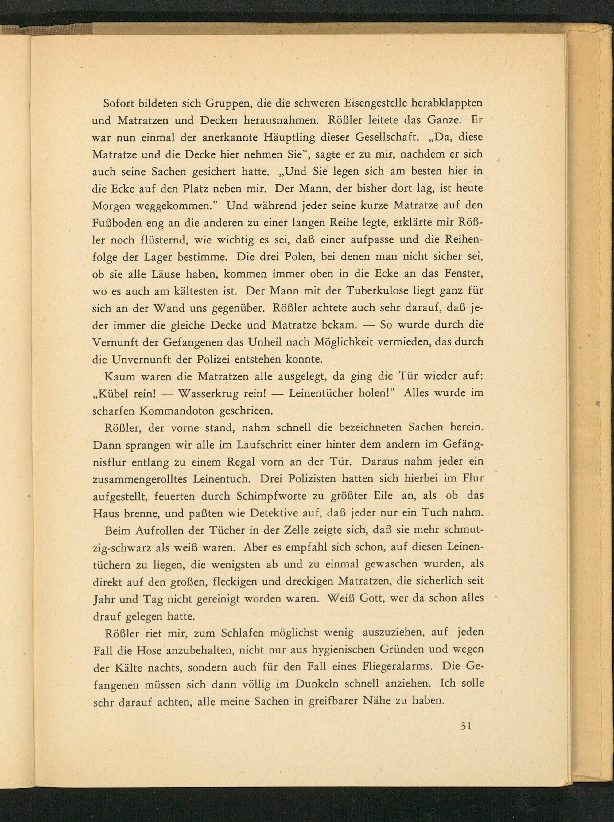 Rößler riet mir, zum Schlafen möglichst wenig auszuziehen, auf jeden Fall die Hose anzubehalten, nicht nur aus hygienischen Gründen und wegen der Kälte nachts, sondern auch für den Fall eines Fliegeralarms. Die Gefangenen müssen sich dann völlig im Dunkeln schnell anziehen. Ich solle sehr darauf achten, alle meine Sachen in greifbarer Nähe zu haben.