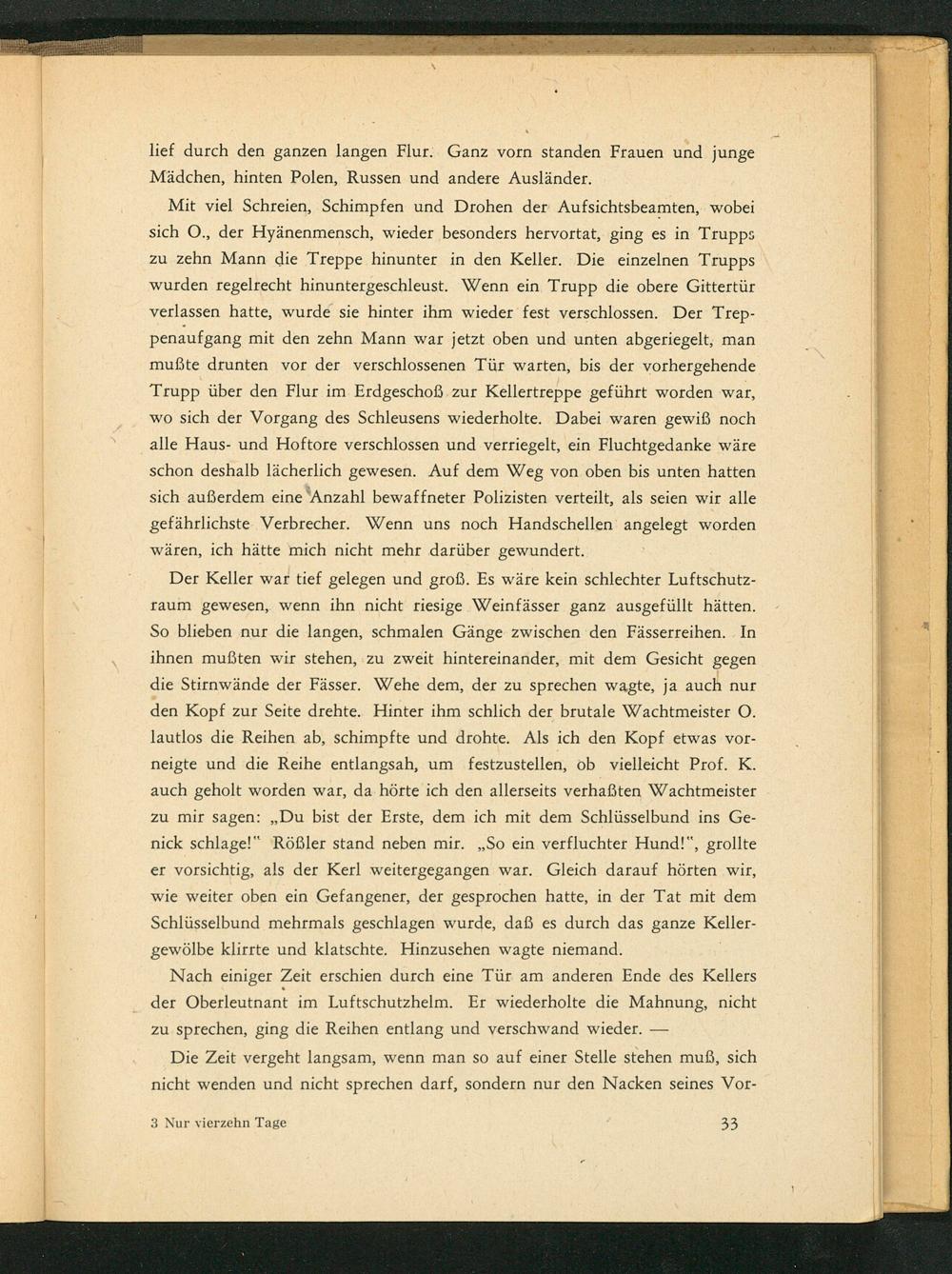 Der Keller war tief gelegen und groß. Es wäre kein schlechter Luftschutzraum gewesen, wenn ihn nicht riesige Weinfässer ganz ausgefüllt hätten. So blieben nur die langen, schmalen Gänge zwischen den Fässerreihen. In ihnen mußten wir stehen, zu zweit hintereinander, mit dem Gesicht gegen die Stirnwände der Fässer. Wehe dem, der zu sprechen wagte, ja auch nur den Kopf zur Seite drehte. Hinter ihm schlich der brutale Wachtmeister O. lautlos die Reihen ab, schimpfte und drohte. Als ich den Kopf etwas vorneigte und die Reihe entlangsah, um festzustellen, ob vielleicht Prof. K. auch geholt worden war, da hörte ich den allerseits verhaßten Wachtmeister zu mir sagen:„ Du bist der Erste, dem ich mit dem Schlüsselbund ins Genick schlage!" Rößler stand neben mir.„ So ein verfluchter Hund!", grollte er vorsichtig, als der Kerl weitergegangen war. Gleich darauf hörten wir, wie weiter oben ein Gefangener, der gesprochen hatte, in der Tat mit dem Schlüsselbund mehrmals geschlagen wurde, daß es durch das ganze Kellergewölbe klirrte und klatschte. Hinzusehen wagte niemand.