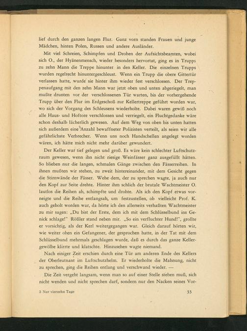 Nach einiger Zeit erschien durch eine Tür am anderen Ende des Kellers der Oberleutnant im Luftschutzhelm. Er wiederholte die Mahnung, nicht zu sprechen, ging die Reihen entlang und verschwand wieder.