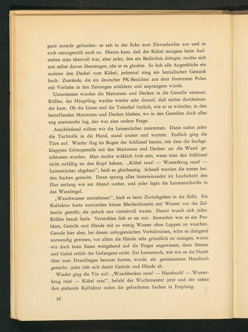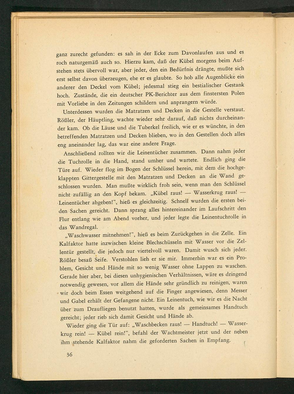 Waschwasser mitnehmen!", hieß es beim Zurückgehen in die Zelle. Ein Kalfaktor hatte inzwischen kleine Blechschüsseln mit Wasser vor die Zellentür gestellt, die jedoch nur viertelvoll waren. Damit wusch sich jeder. Röẞler besaß Seife. Verstohlen lieh er sie mir. Immerhin war es ein Problem, Gesicht und Hände mit so wenig Wasser ohne Lappen zu waschen. Gerade hier aber, bei diesen unhygienischen Verhältnissen, wäre es dringend notwendig gewesen, vor allem die Hände sehr gründlich zu reinigen, waren wir doch beim Essen weitgehend auf die Finger angewiesen, denn Messer und Gabel erhält der Gefangene nicht. Ein Leinentuch, wie wir es die Nacht über zum Draufliegen benutzt hatten, wurde als gemeinsames Handtuch gereicht; jeder rieb sich damit Gesicht und Hände ab. Wieder ging die Tür auf:„ Waschbecken raus! krug rein!