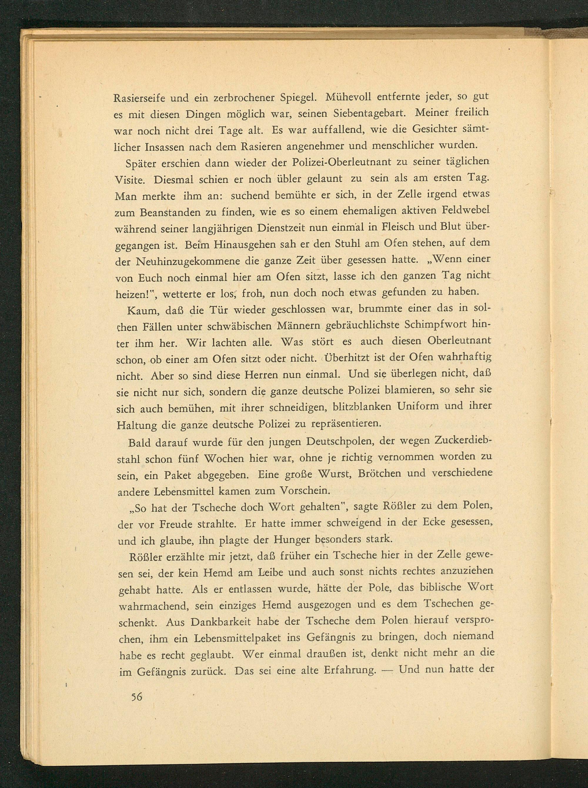 Rasierseife und ein zerbrochener Spiegel. Mühevoll entfernte jeder, so gut es mit diesen Dingen möglich war, seinen Siebentagebart. Meiner freilich war noch nicht drei Tage alt. Es war auffallend, wie die Gesichter sämt- licher Insassen nach dem Rasieren angenehmer und menschlicher wurden.