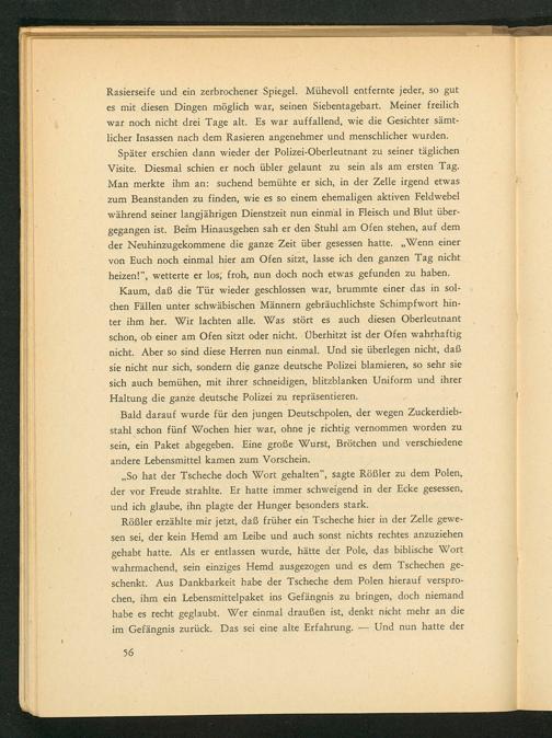 Rößler erzählte mir jetzt, daß früher ein Tscheche hier in der Zelle gewe- sen sei, der kein Hemd am Leibe und auch sonst nichts rechtes anzuziehen gehabt hatte. Als er entlassen wurde, hätte der Pole, das biblische Wort wahrmachend, sein einziges Hemd ausgezogen und es dem Tschechen ge- schenkt. Aus Dankbarkeit habe der Tscheche dem Polen hierauf verspro- chen, ihm ein Lebensmittelpaket ins Gefängnis zu bringen, doch niemand habe es recht geglaubt. Wer einmal draußen ist, denkt nicht mehr an die