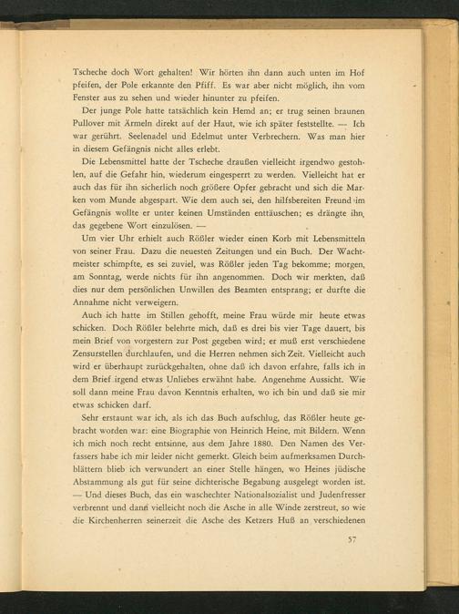 Um vier Uhr erhielt auch Rößler wieder einen Korb mit Lebensmitteln von seiner Frau. Dazu die neuesten Zeitungen und ein Buch. Der Wachtmeister schimpfte, es sei zuviel, was Rößler jeden Tag bekomme; morgen, am Sonntag, werde nichts für ihn angenommen. Doch wir merkten, daß dies nur dem persönlichen Unwillen des Beamten entsprang; er durfte die Annahme nicht verweigern.