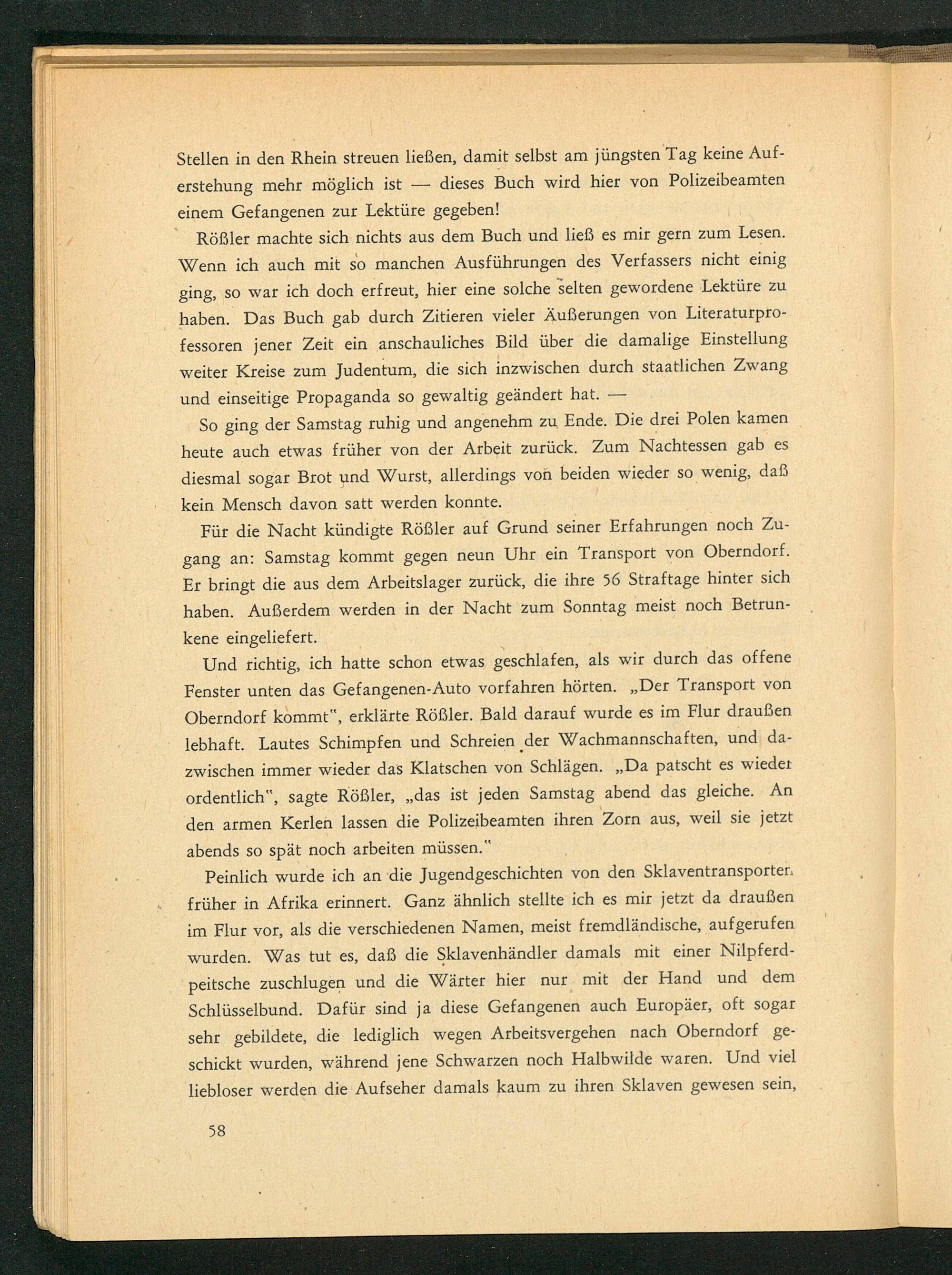 Peinlich wurde ich an die Jugendgeschichten von den Sklaventransporter. früher in Afrika erinnert. Ganz ähnlich stellte ich es mir jetzt da draußen im Flur vor, als die verschiedenen Namen, meist fremdländische, aufgerufen wurden. Was tut es, daß die Sklavenhändler damals mit einer Nilpferdpeitsche zuschlugen und die Wärter hier nur mit der Hand und dem Schlüsselbund. Dafür sind ja diese Gefangenen auch Europäer, oft sogar sehr gebildete, die lediglich wegen Arbeitsvergehen nach Oberndorf geschickt wurden, während jene Schwarzen noch Halbwilde waren. Und viel liebloser werden die Aufseher damals kaum zu ihren Sklaven gewesen sein,